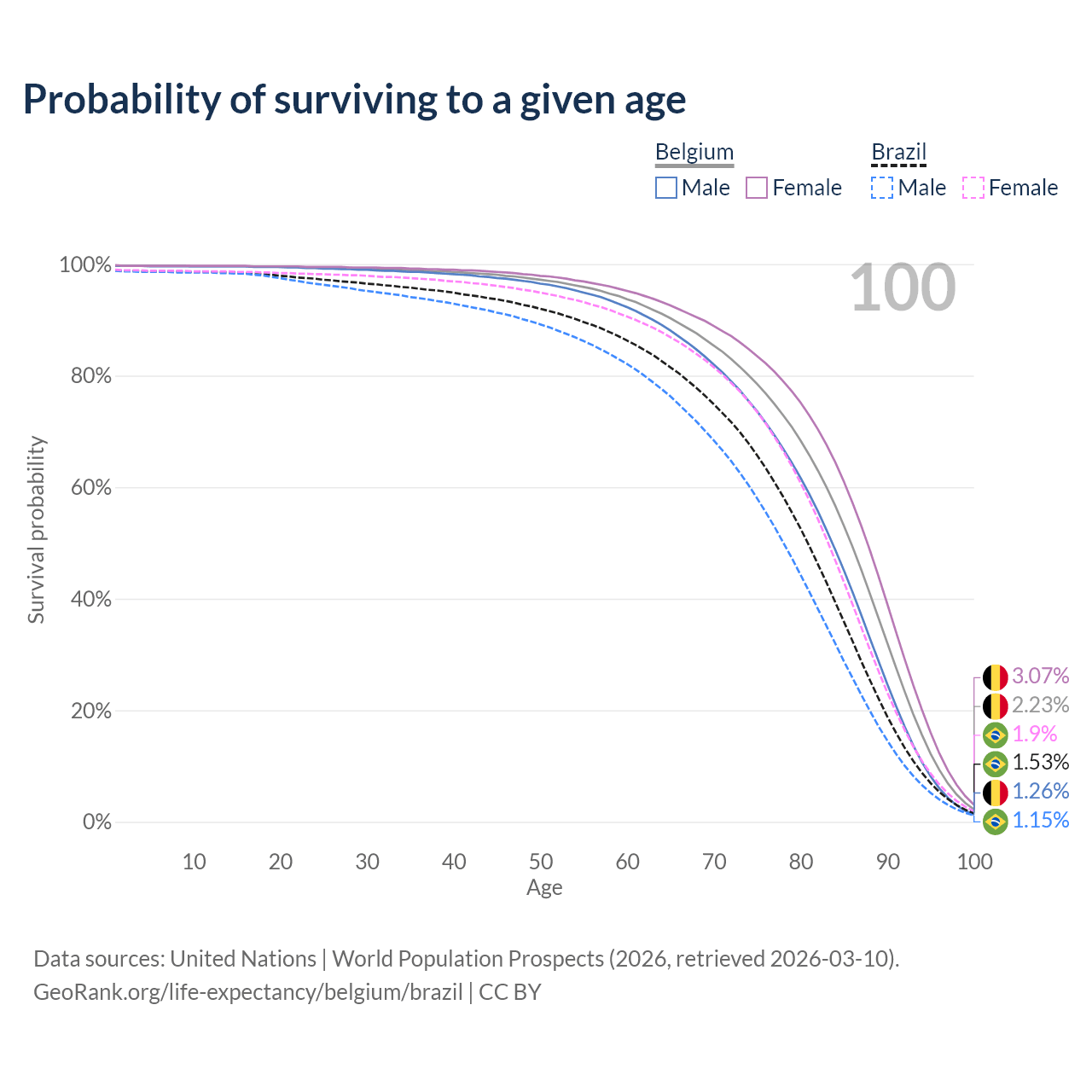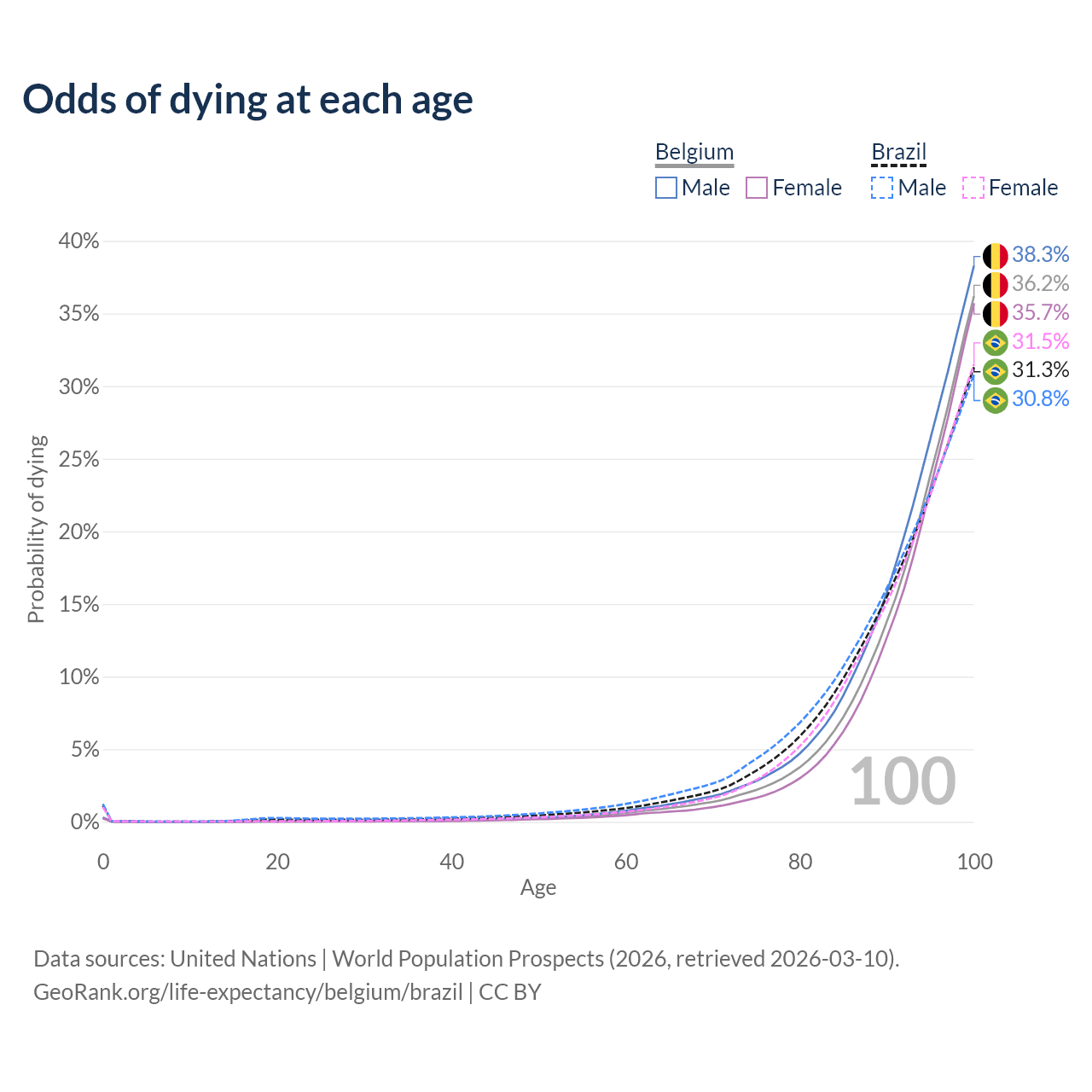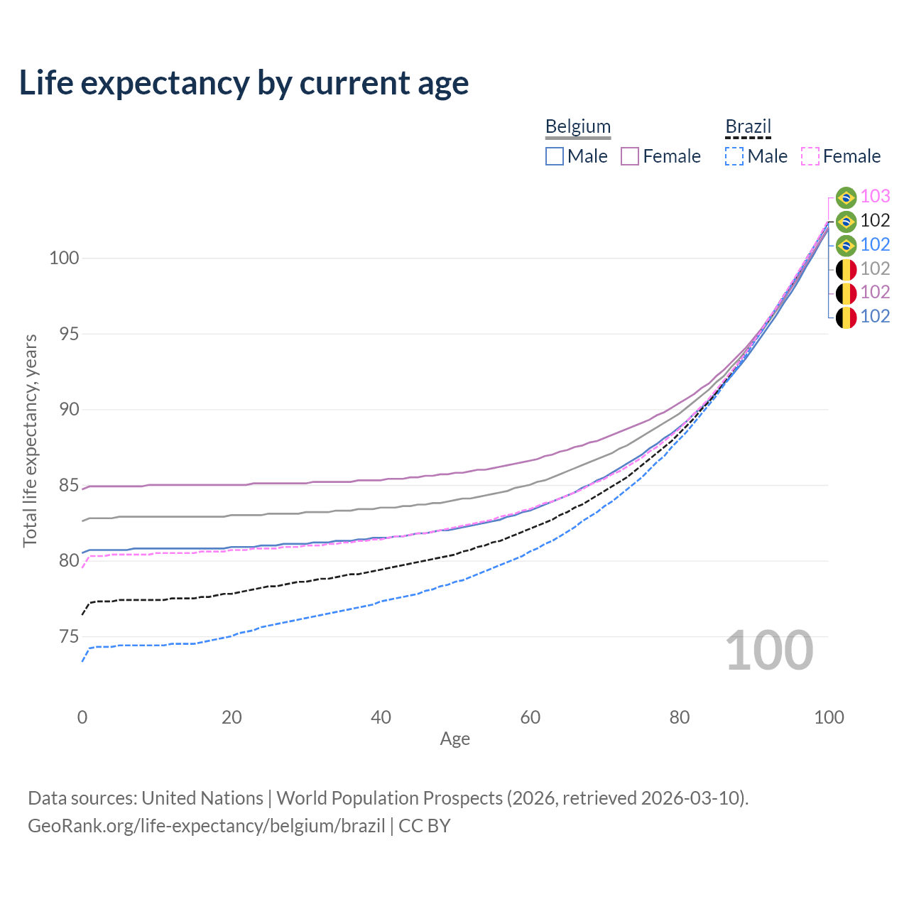 This life expectancy calculator shows the odds of living to 100, 95, 90, and below based on current age for both males and females in Belgium and Brazil, along with mean and median age of death. The calculations are based on the 2026 life tables (actuarial tables) from the UN World Population Prospects.