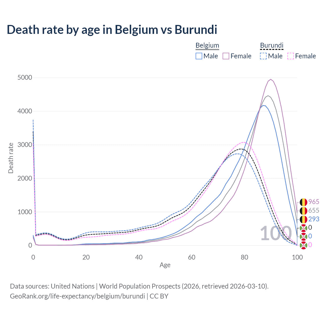 In Belgium, the most common age of death is 89, compared to 0 in Burundi. The median age of death is 85.8 in Belgium and 71.6 in Burundi, meaning only half of each cohort is expected to live past that age.