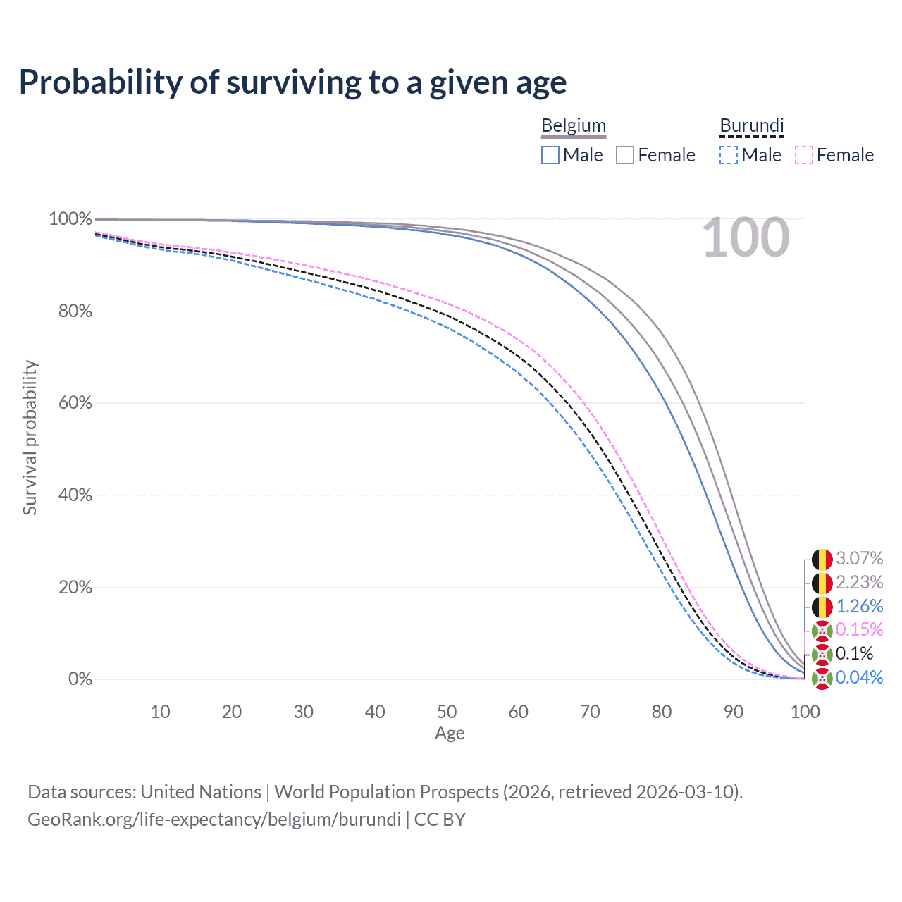 This life expectancy calculator shows the odds of living to 100, 95, 90, and below based on current age for both males and females in Belgium and Burundi, along with mean and median age of death. The calculations are based on the 2026 life tables (actuarial tables) from the UN World Population Prospects.
