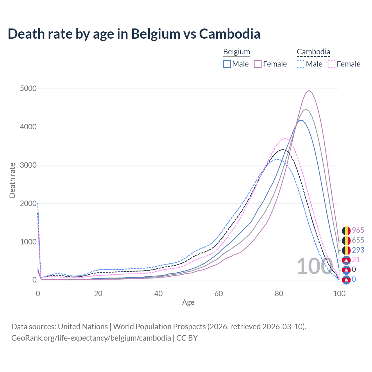 In Belgium, the most common age of death is 89, compared to 81 in Cambodia. The median age of death is 85.8 in Belgium and 76.5 in Cambodia, meaning only half of each cohort is expected to live past that age.