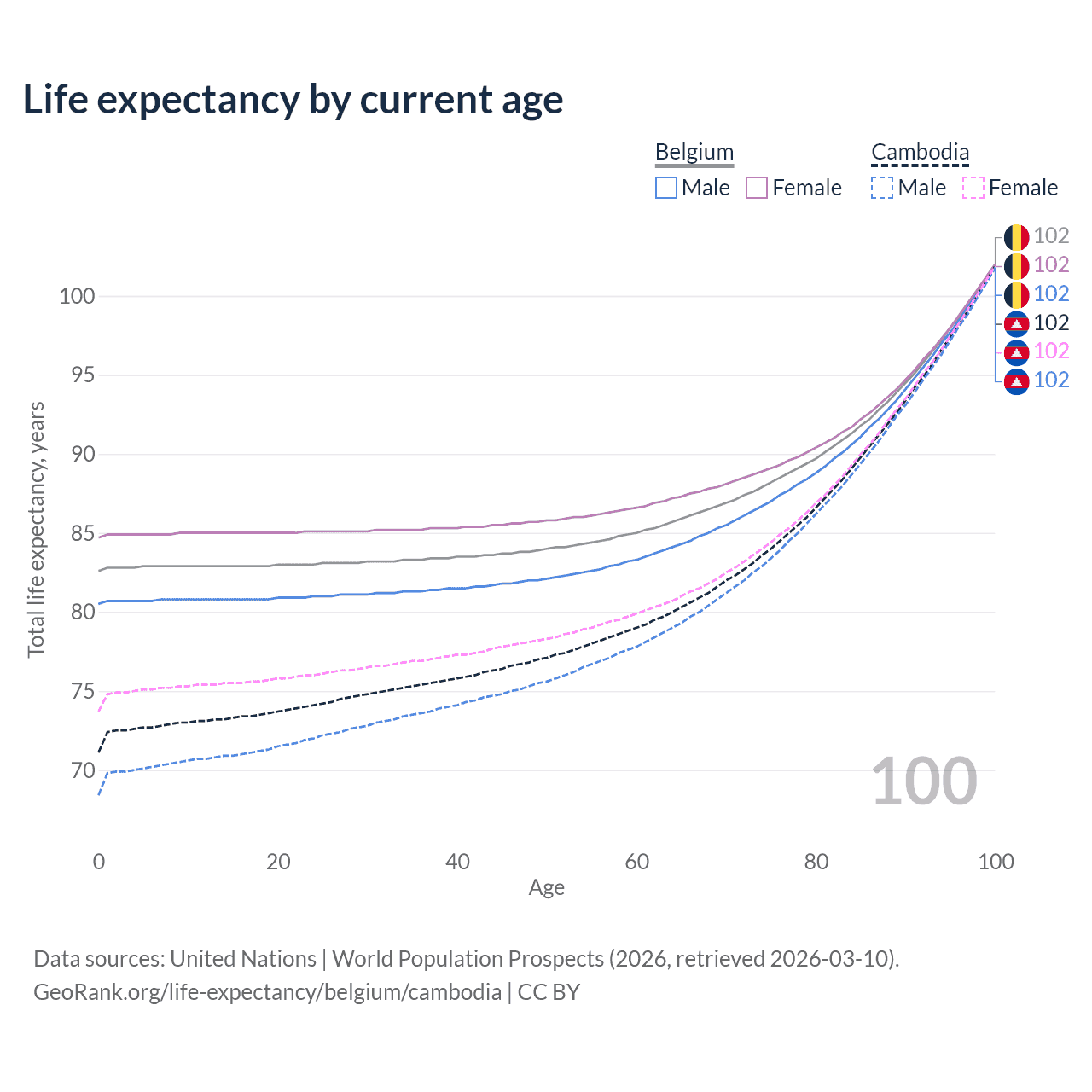 This life expectancy calculator shows the odds of living to 100, 95, 90, and below based on current age for both males and females in Belgium and Cambodia, along with mean and median age of death. The calculations are based on the 2026 life tables (actuarial tables) from the UN World Population Prospects.