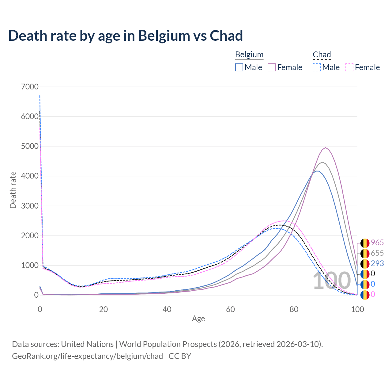 In Belgium, the most common age of death is 89, compared to 0 in Chad. The median age of death is 85.8 in Belgium and 64.8 in Chad, meaning only half of each cohort is expected to live past that age.