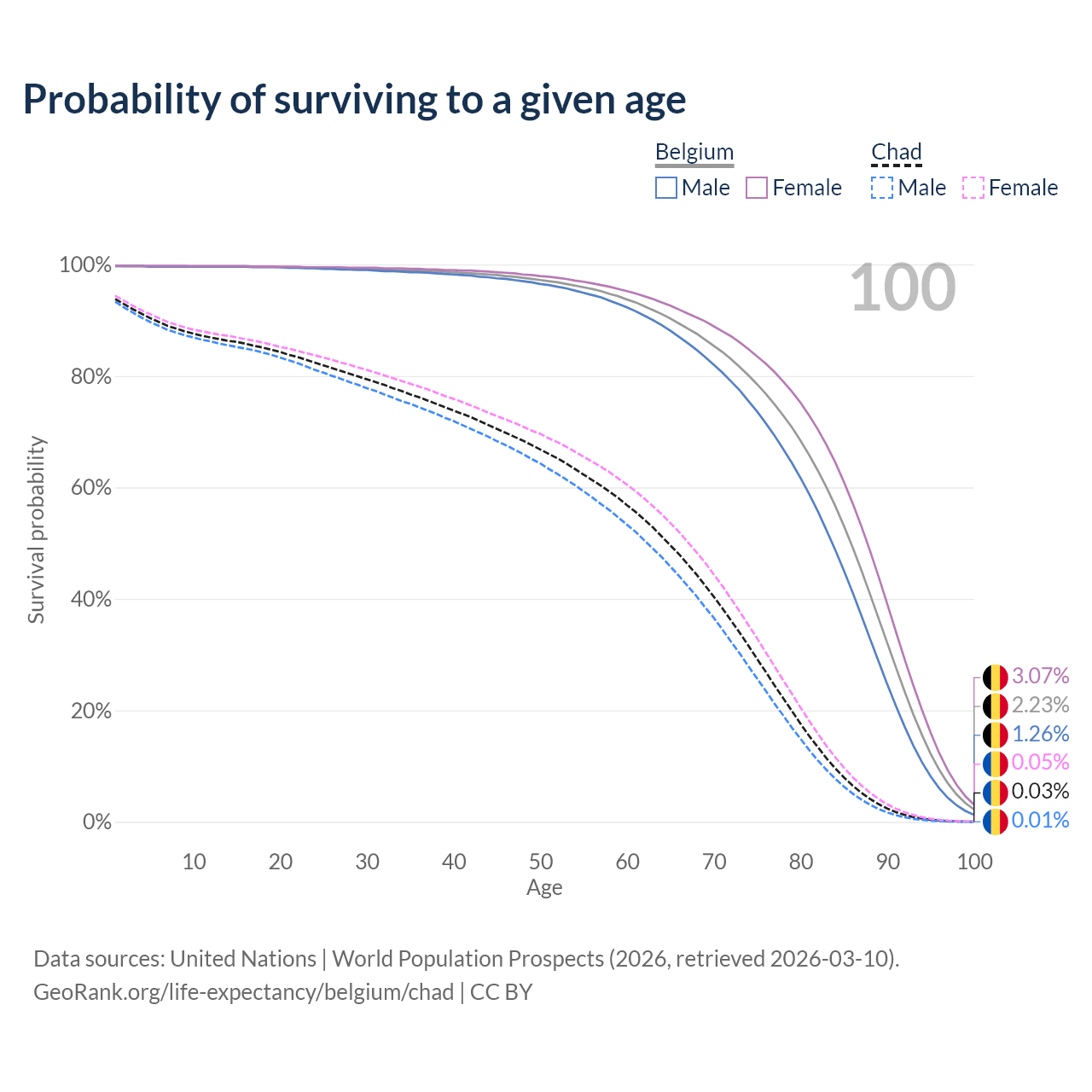 This life expectancy calculator shows the odds of living to 100, 95, 90, and below based on current age for both males and females in Belgium and Chad, along with mean and median age of death. The calculations are based on the 2026 life tables (actuarial tables) from the UN World Population Prospects.