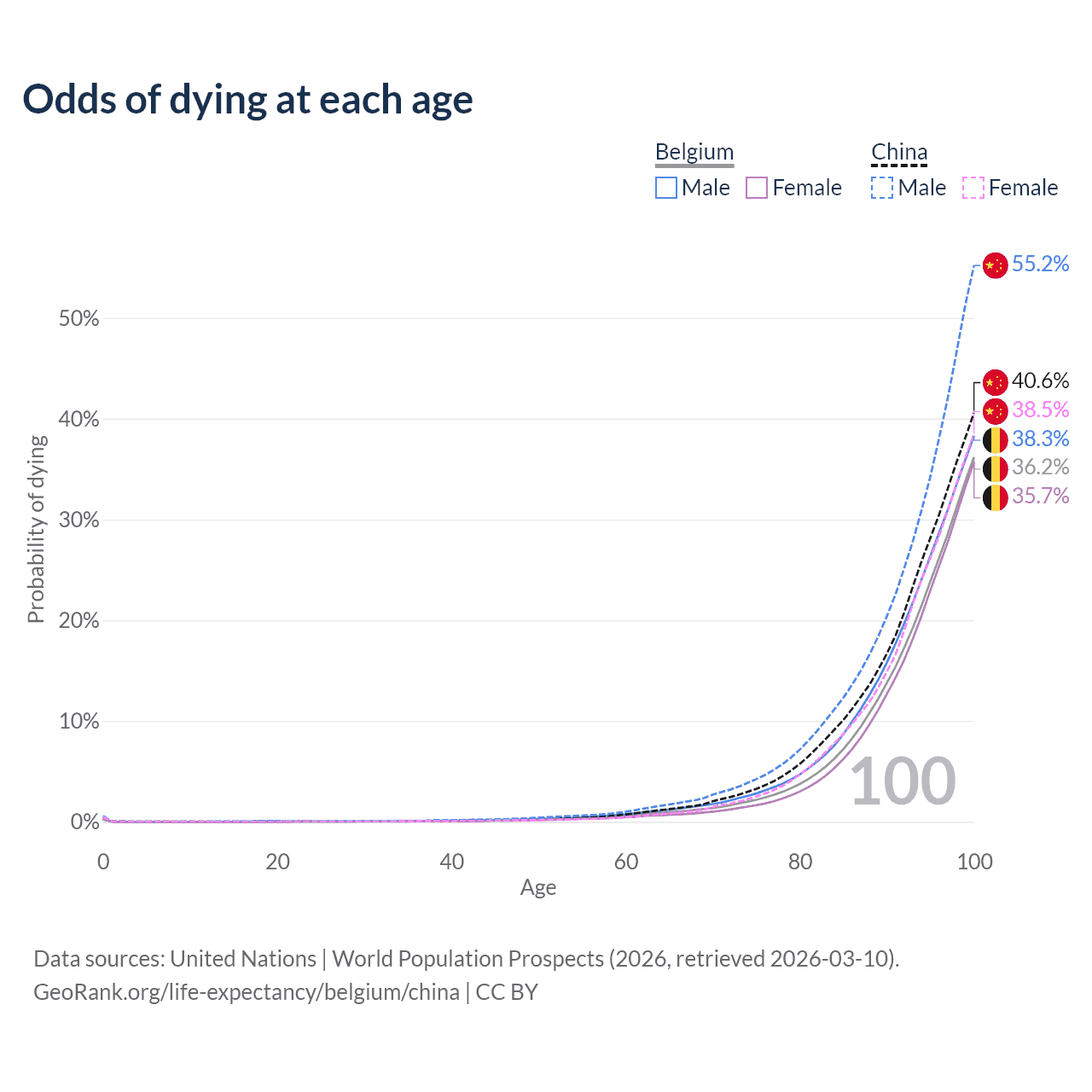 This life expectancy calculator shows the odds of living to 100, 95, 90, and below based on current age for both males and females in Belgium and China, along with mean and median age of death. The calculations are based on the 2026 life tables (actuarial tables) from the UN World Population Prospects.