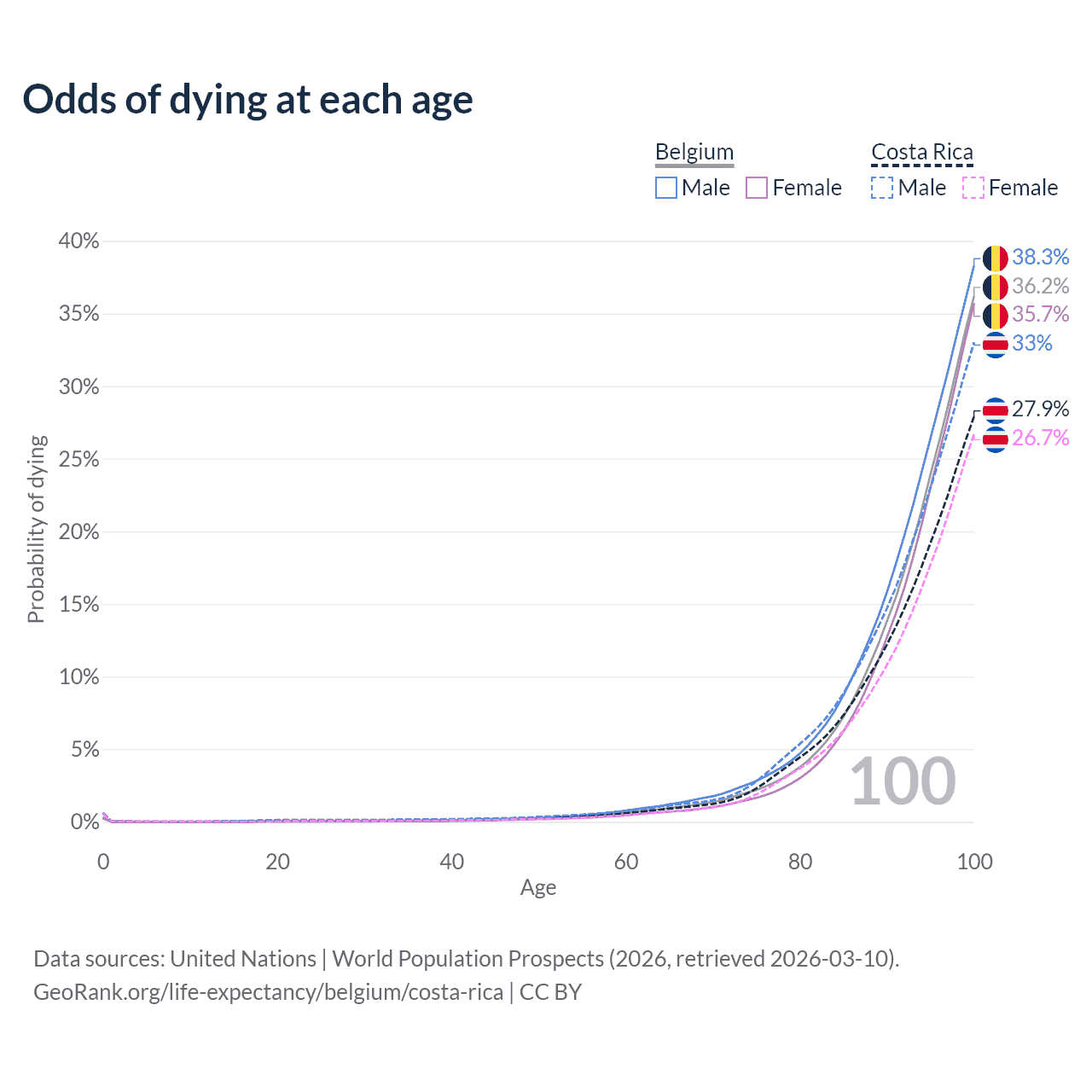 This life expectancy calculator shows the odds of living to 100, 95, 90, and below based on current age for both males and females in Belgium and Costa Rica, along with mean and median age of death. The calculations are based on the 2026 life tables (actuarial tables) from the UN World Population Prospects.
