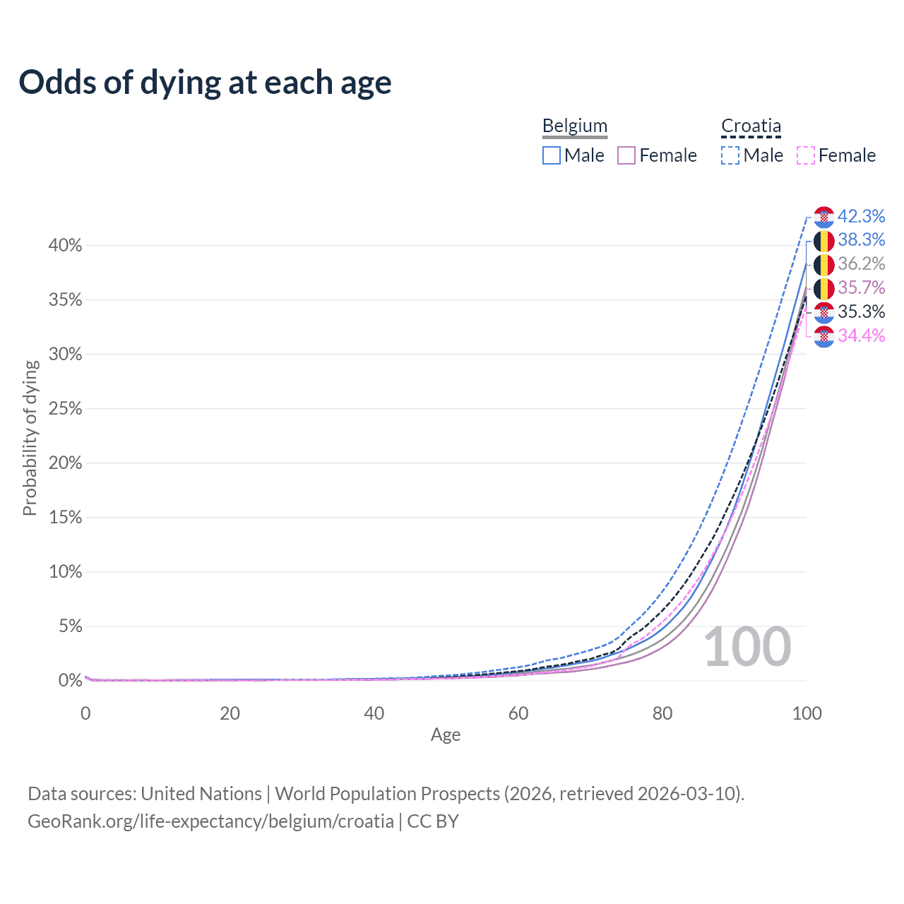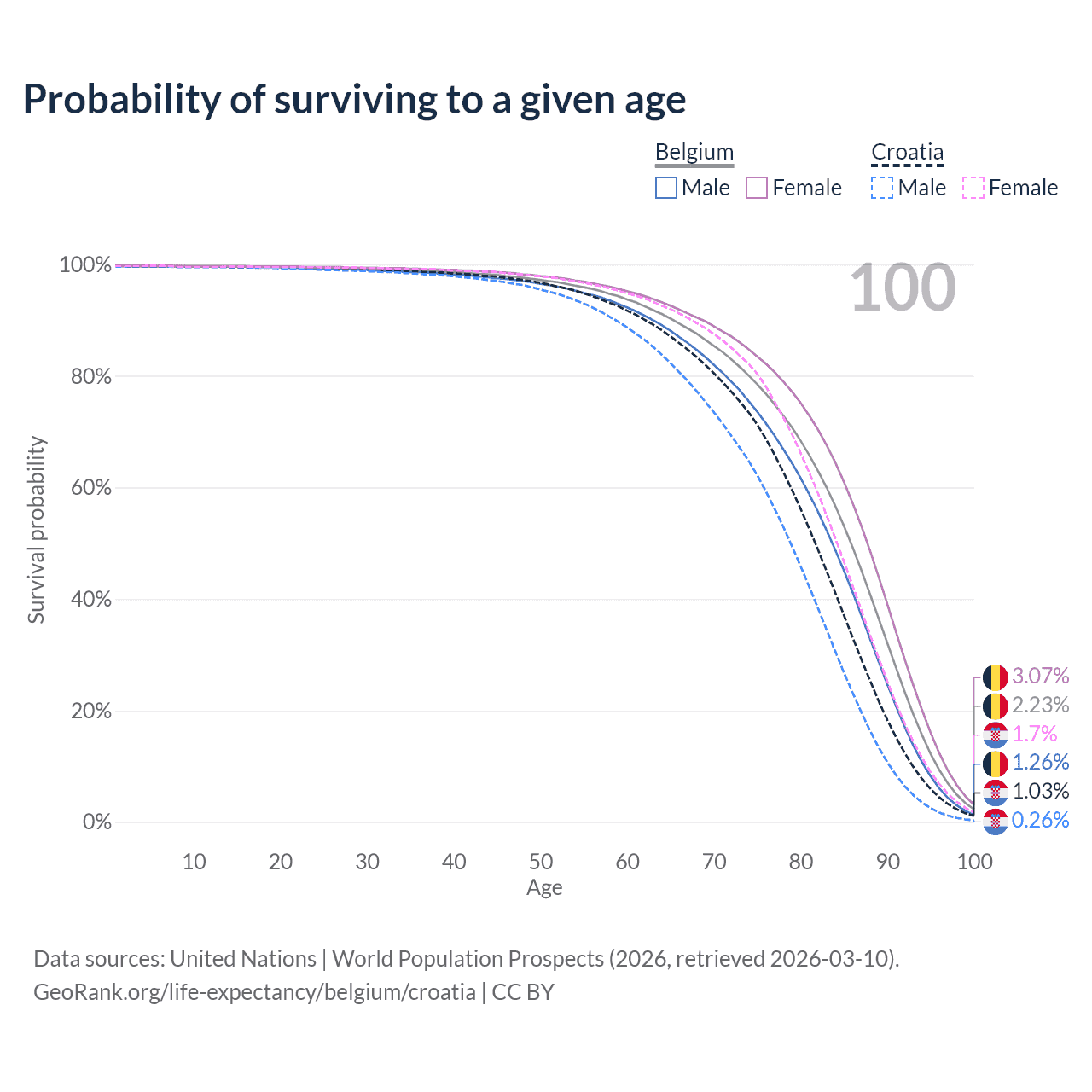 This life expectancy calculator shows the odds of living to 100, 95, 90, and below based on current age for both males and females in Belgium and Croatia, along with mean and median age of death. The calculations are based on the 2026 life tables (actuarial tables) from the UN World Population Prospects.