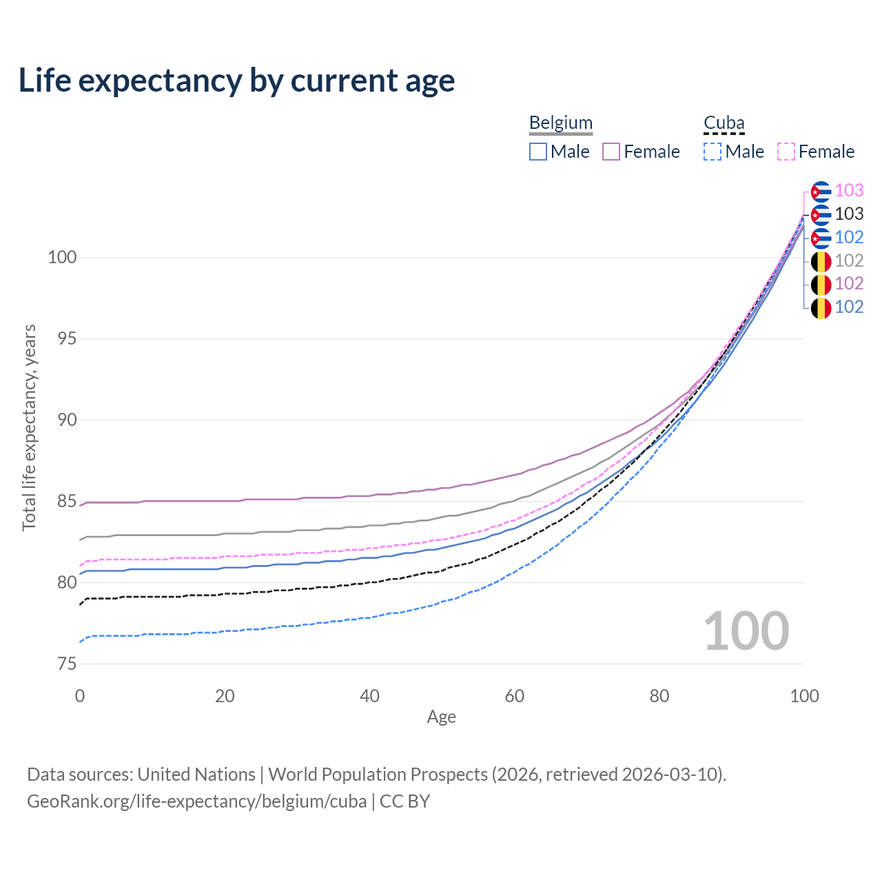 This life expectancy calculator shows the odds of living to 100, 95, 90, and below based on current age for both males and females in Belgium and Cuba, along with mean and median age of death. The calculations are based on the 2026 life tables (actuarial tables) from the UN World Population Prospects.
