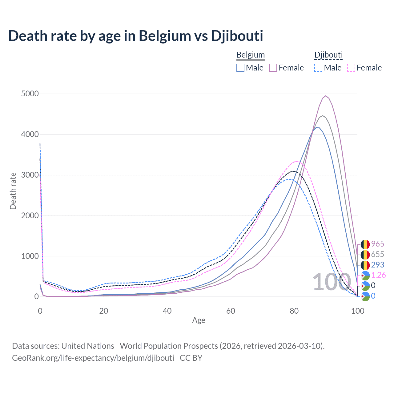 In Belgium, the most common age of death is 89, compared to 0 in Djibouti. The median age of death is 85.8 in Belgium and 73.7 in Djibouti, meaning only half of each cohort is expected to live past that age.