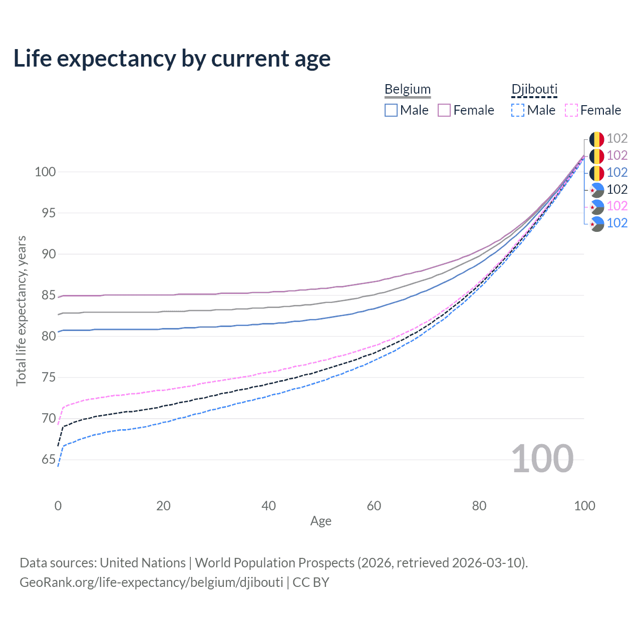 This life expectancy calculator shows the odds of living to 100, 95, 90, and below based on current age for both males and females in Belgium and Djibouti, along with mean and median age of death. The calculations are based on the 2026 life tables (actuarial tables) from the UN World Population Prospects.
