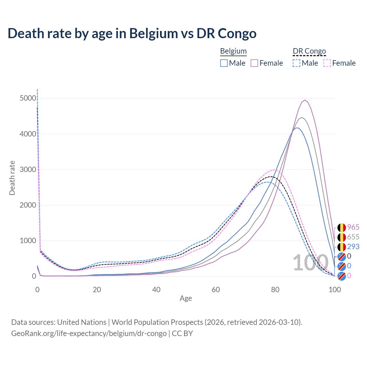 This life expectancy calculator shows the odds of living to 100, 95, 90, and below based on current age for both males and females in Belgium and the DR Congo, along with mean and median age of death. The calculations are based on the 2026 life tables (actuarial tables) from the UN World Population Prospects.