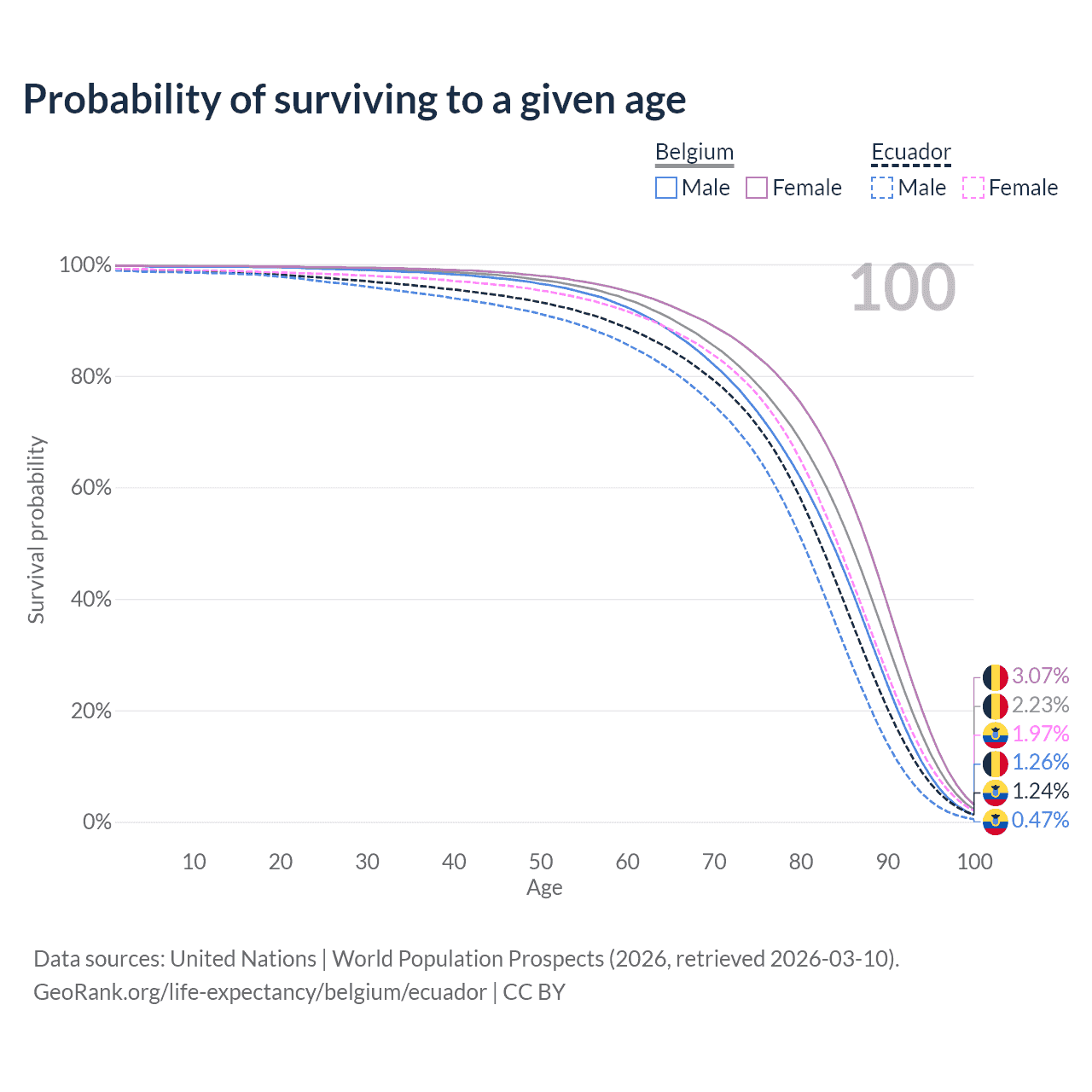 This life expectancy calculator shows the odds of living to 100, 95, 90, and below based on current age for both males and females in Belgium and Ecuador, along with mean and median age of death. The calculations are based on the 2026 life tables (actuarial tables) from the UN World Population Prospects.