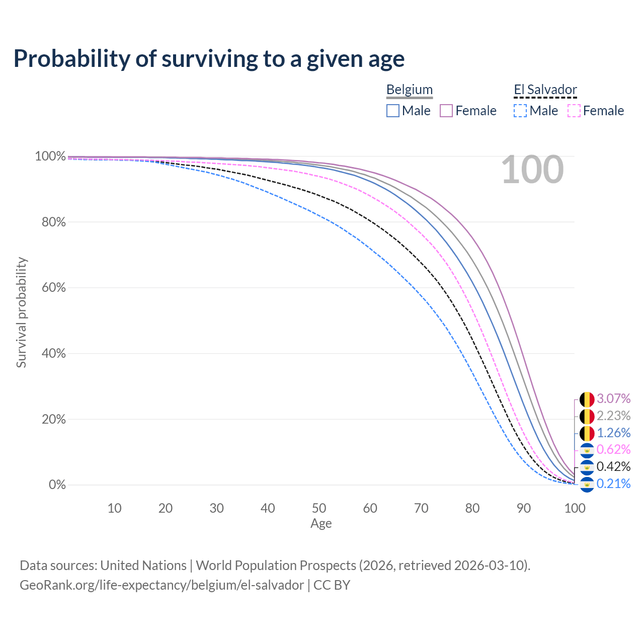 This life expectancy calculator shows the odds of living to 100, 95, 90, and below based on current age for both males and females in Belgium and El Salvador, along with mean and median age of death. The calculations are based on the 2026 life tables (actuarial tables) from the UN World Population Prospects.