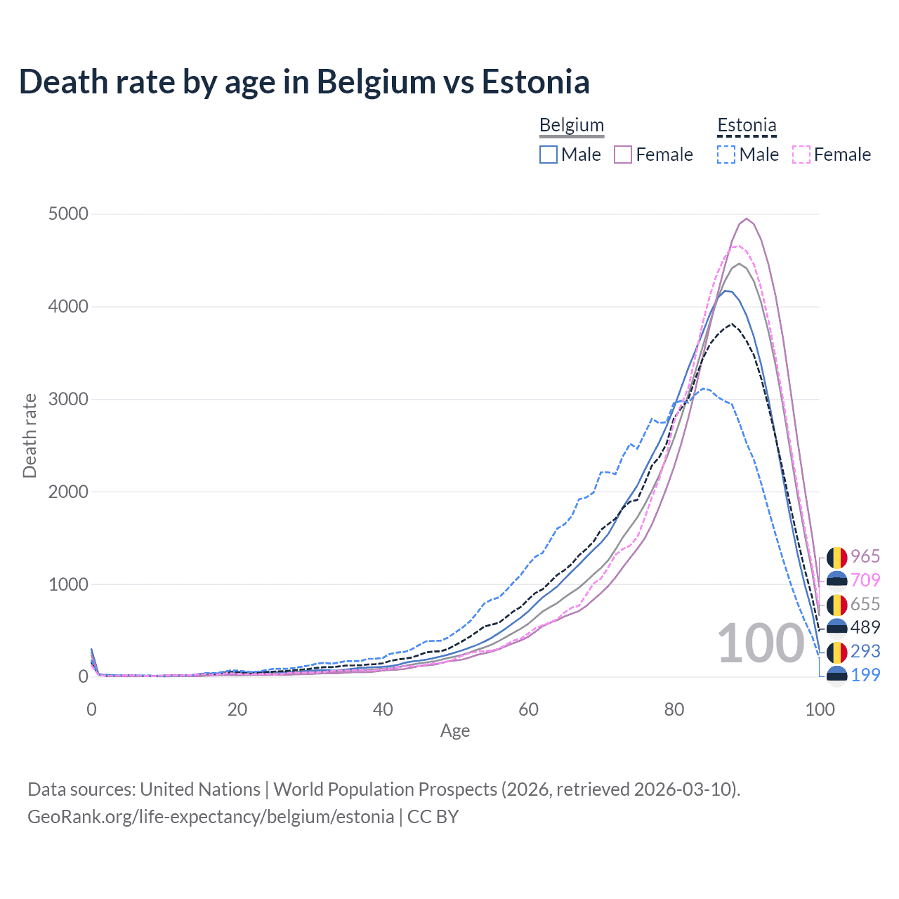 This life expectancy calculator shows the odds of living to 100, 95, 90, and below based on current age for both males and females in Belgium and Estonia, along with mean and median age of death. The calculations are based on the 2026 life tables (actuarial tables) from the UN World Population Prospects.