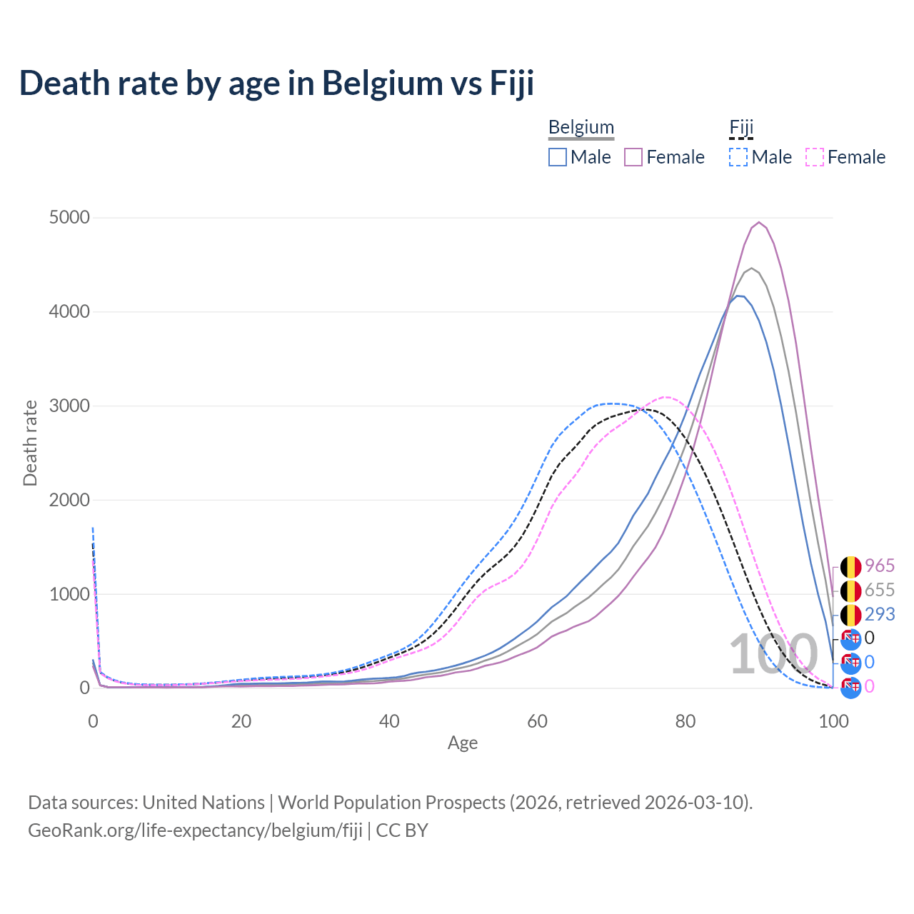 In Belgium, the most common age of death is 89, compared to 74 in Fiji. The median age of death is 85.8 in Belgium and 70.5 in Fiji, meaning only half of each cohort is expected to live past that age.