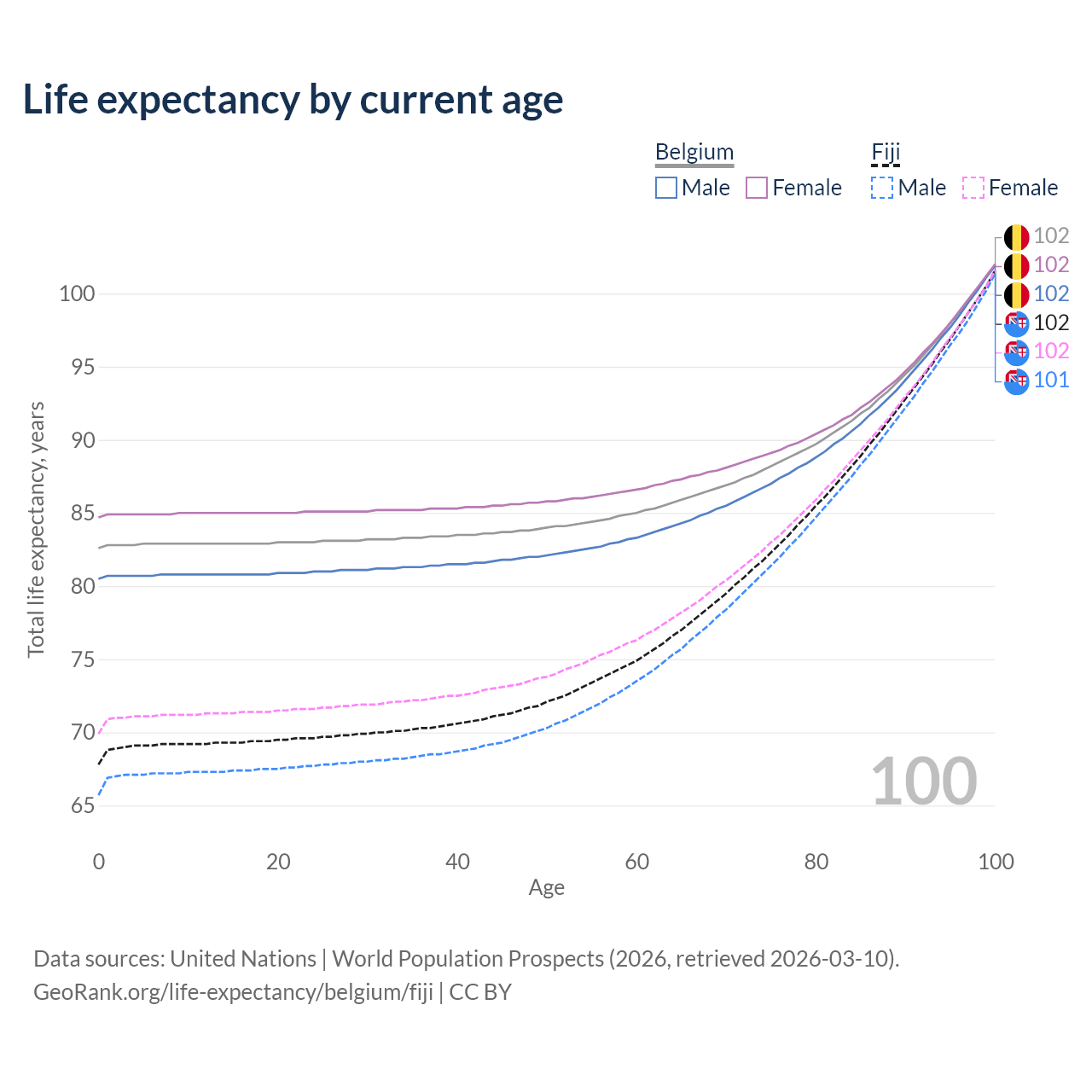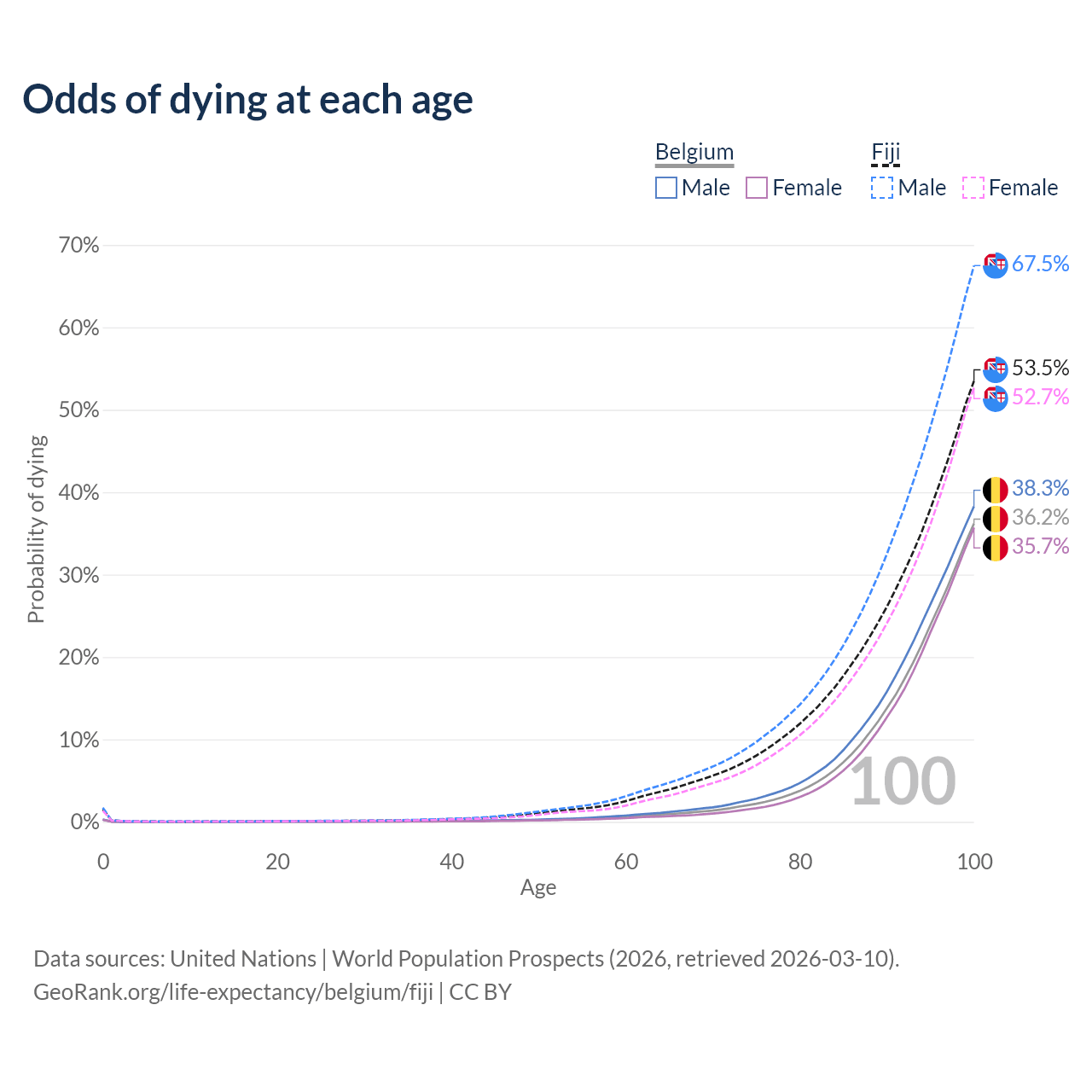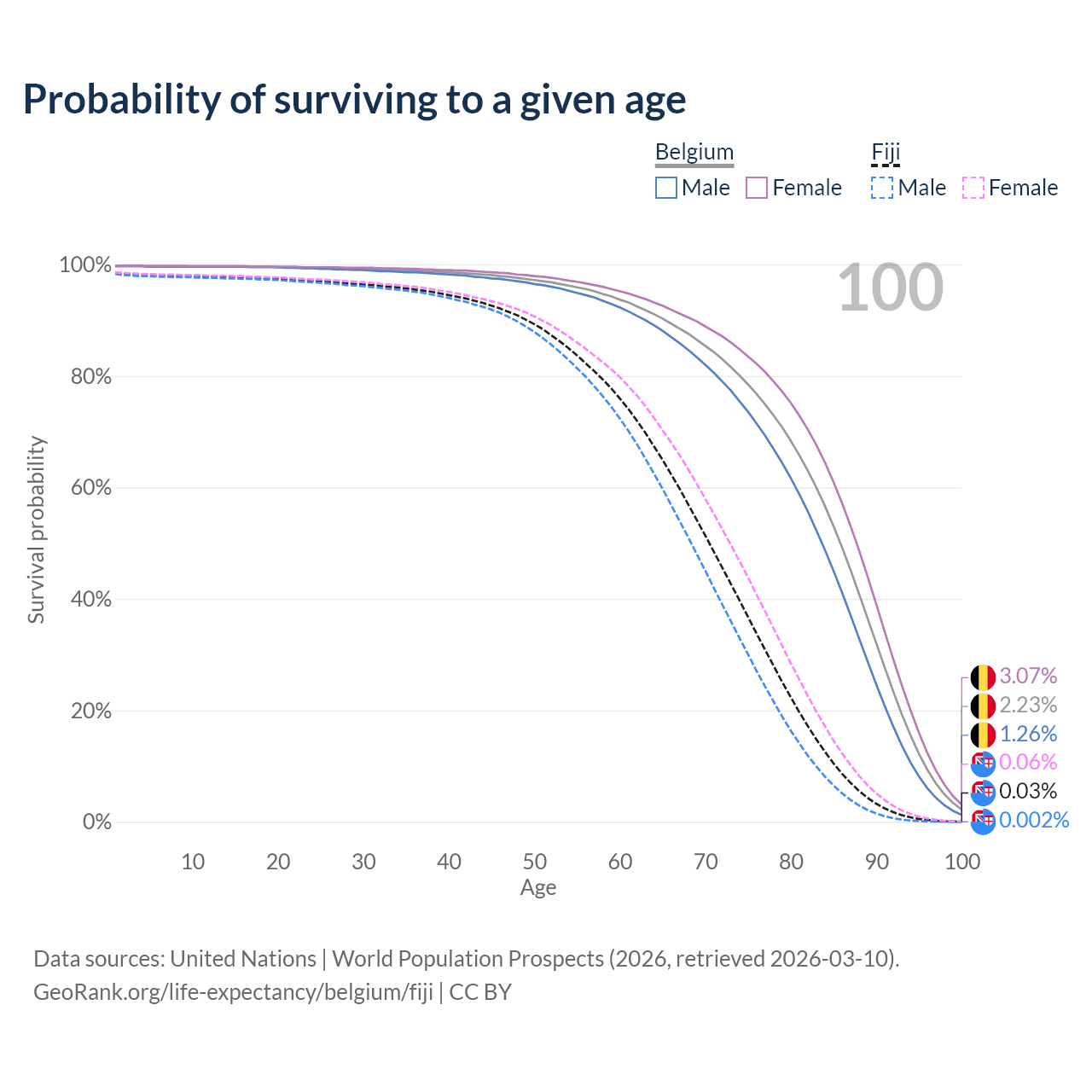 This life expectancy calculator shows the odds of living to 100, 95, 90, and below based on current age for both males and females in Belgium and Fiji, along with mean and median age of death. The calculations are based on the 2026 life tables (actuarial tables) from the UN World Population Prospects.