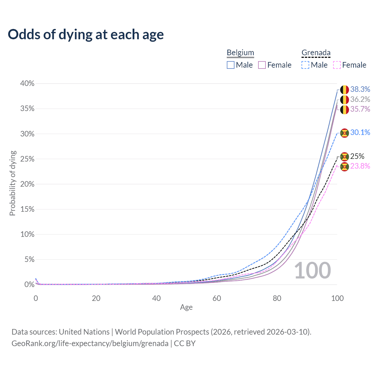 This life expectancy calculator shows the odds of living to 100, 95, 90, and below based on current age for both males and females in Belgium and Grenada, along with mean and median age of death. The calculations are based on the 2026 life tables (actuarial tables) from the UN World Population Prospects.