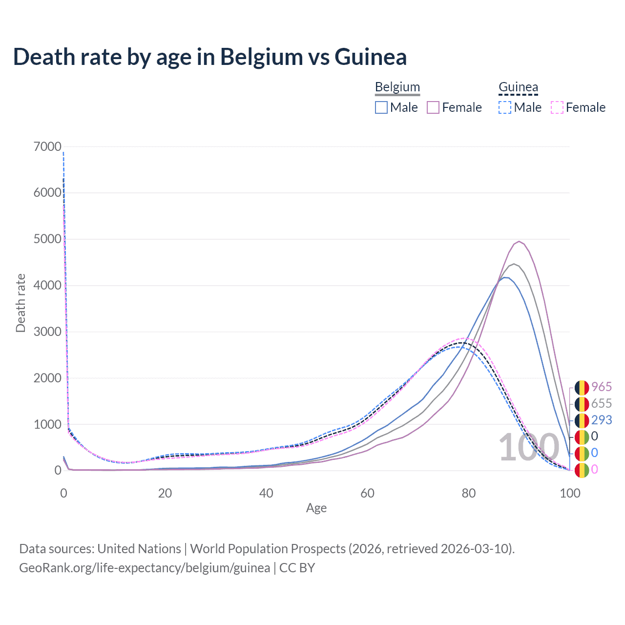 In Belgium, the most common age of death is 89, compared to 0 in Guinea. The median age of death is 85.8 in Belgium and 70.6 in Guinea, meaning only half of each cohort is expected to live past that age.