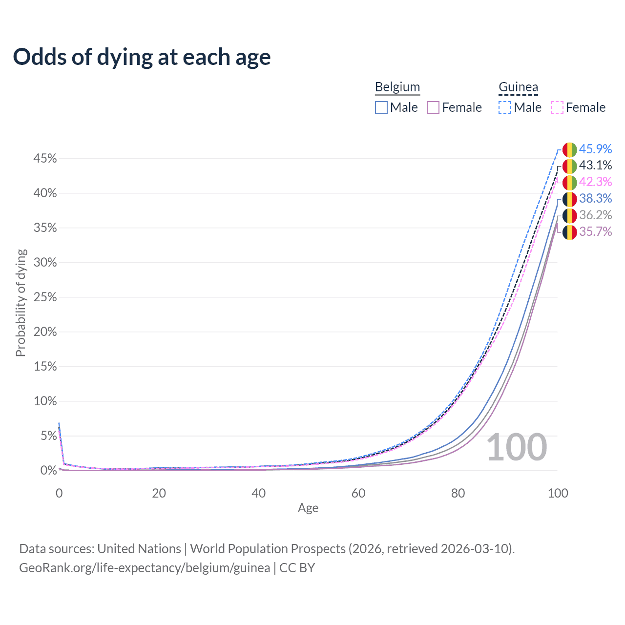 This life expectancy calculator shows the odds of living to 100, 95, 90, and below based on current age for both males and females in Belgium and Guinea, along with mean and median age of death. The calculations are based on the 2026 life tables (actuarial tables) from the UN World Population Prospects.