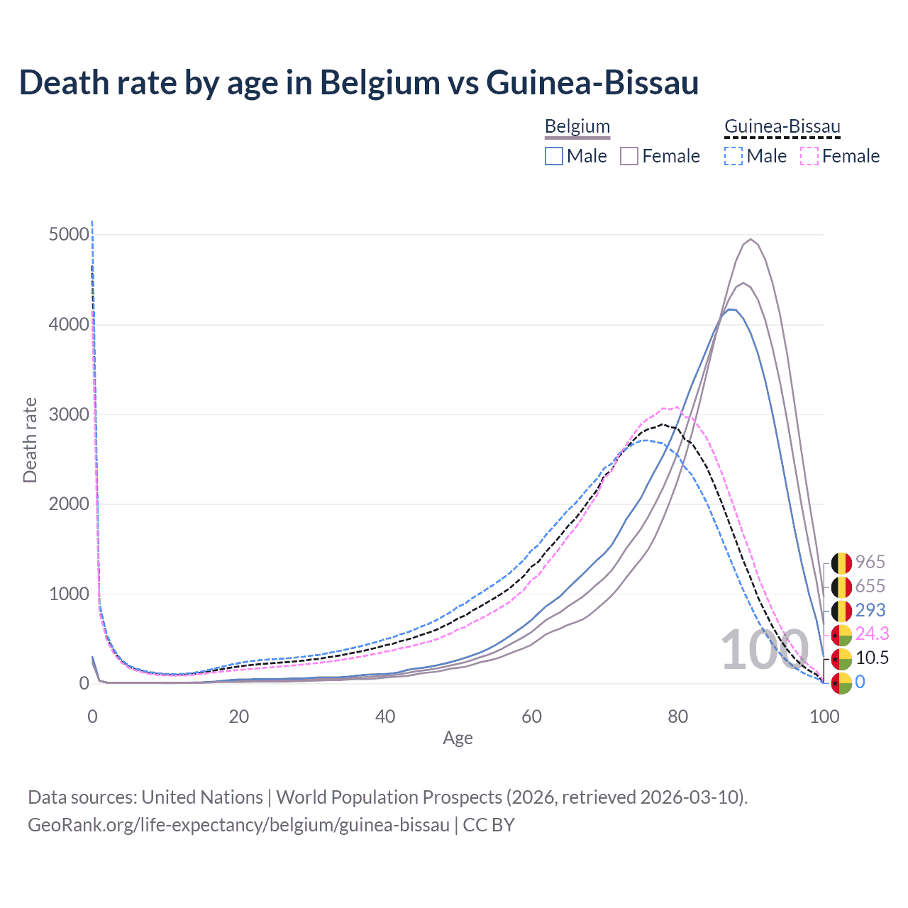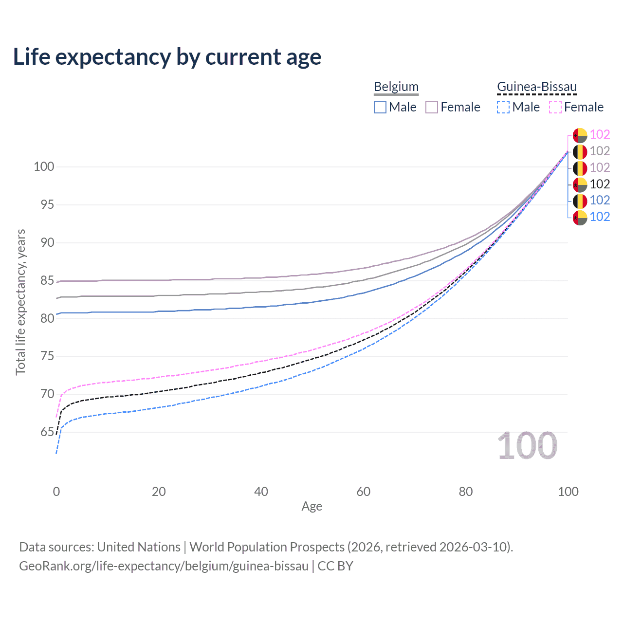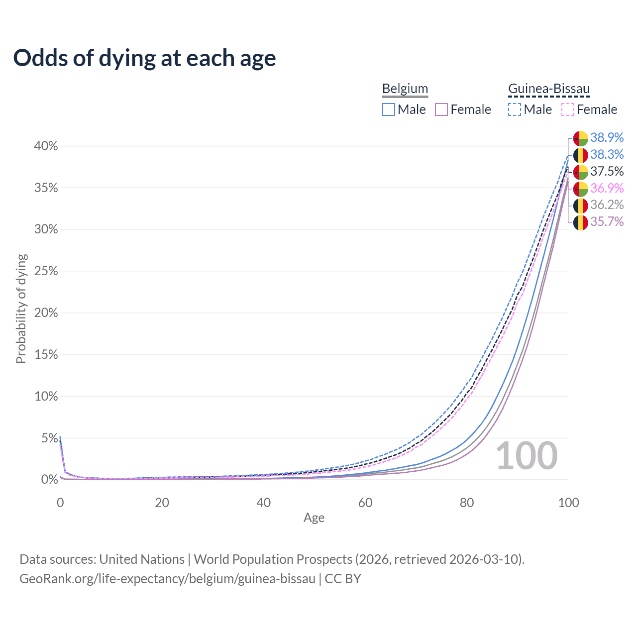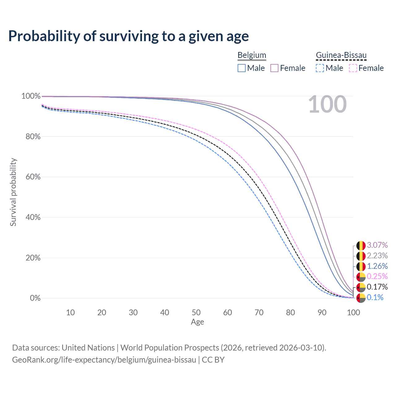 This life expectancy calculator shows the odds of living to 100, 95, 90, and below based on current age for both males and females in Belgium and Guinea-Bissau, along with mean and median age of death. The calculations are based on the 2026 life tables (actuarial tables) from the UN World Population Prospects.