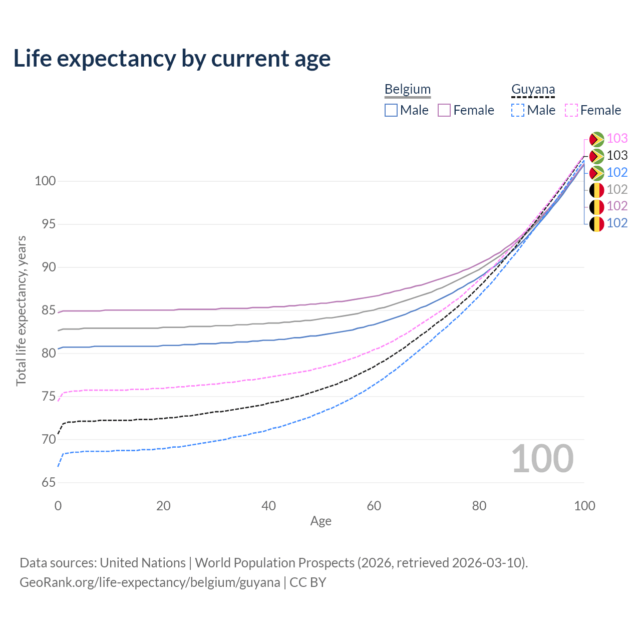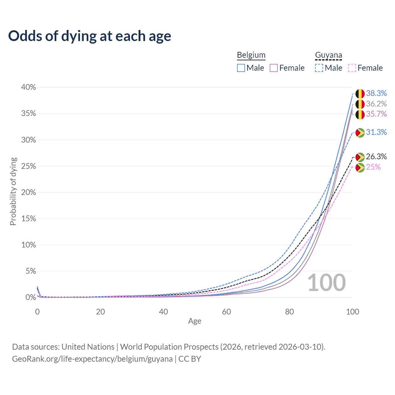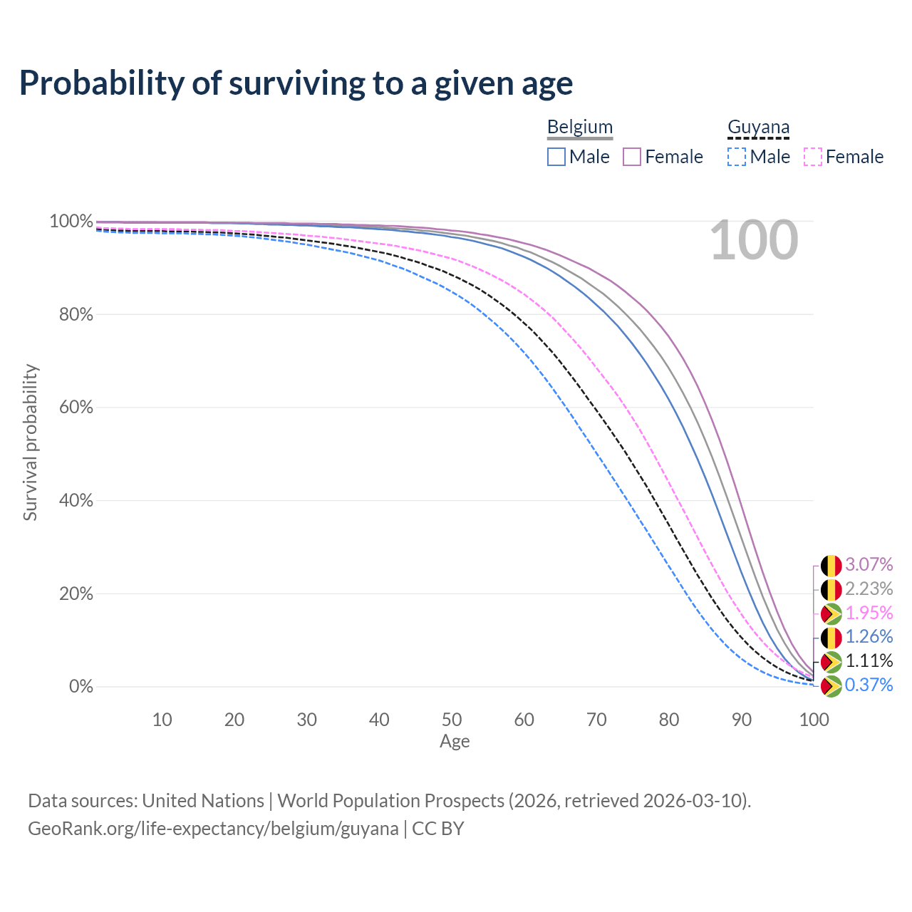 This life expectancy calculator shows the odds of living to 100, 95, 90, and below based on current age for both males and females in Belgium and Guyana, along with mean and median age of death. The calculations are based on the 2026 life tables (actuarial tables) from the UN World Population Prospects.