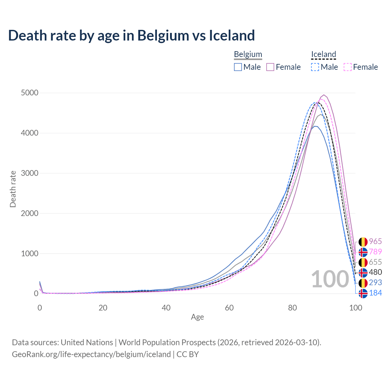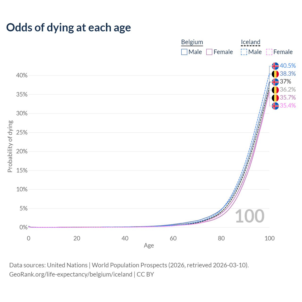 This life expectancy calculator shows the odds of living to 100, 95, 90, and below based on current age for both males and females in Belgium and Iceland, along with mean and median age of death. The calculations are based on the 2026 life tables (actuarial tables) from the UN World Population Prospects.