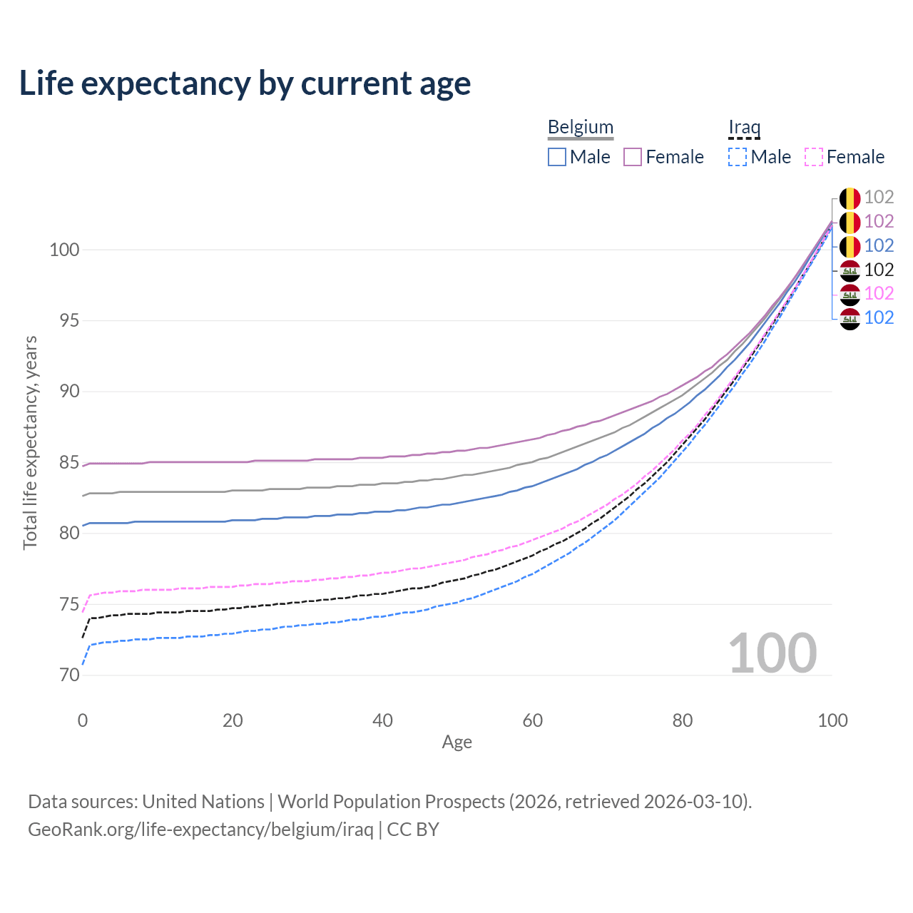 The average life expectancy at birth is 82.6 years in Belgium vs 72.6 in Iraq. Belgium is ranked 26/197 by life expectancy, and Iraq is 118/197. In Belgium, the life expectancy is 80.5 years for males and 84.7 years for females. In Iraq, it's 70.7 years for males and 74.4 years for females.