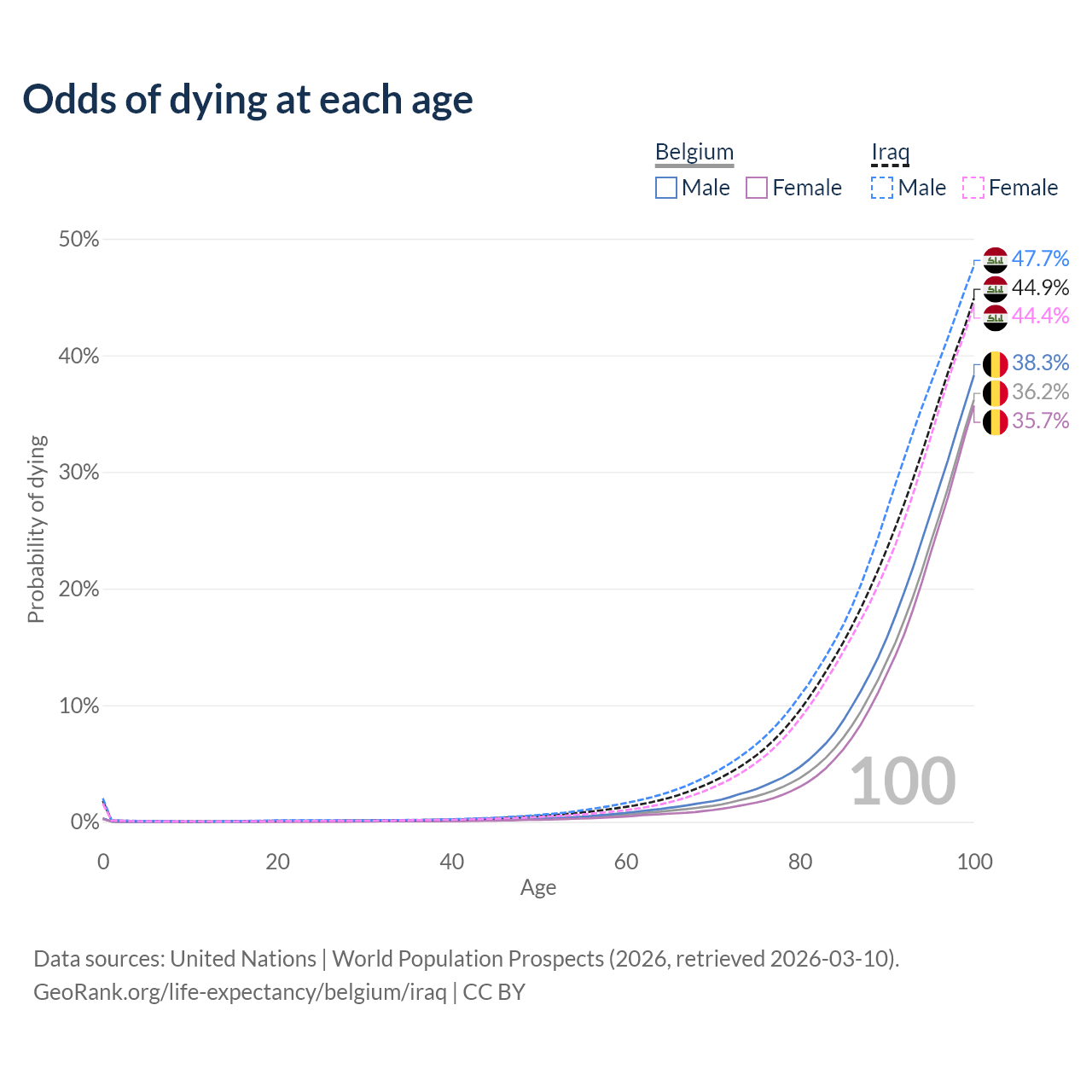 This life expectancy calculator shows the odds of living to 100, 95, 90, and below based on current age for both males and females in Belgium and Iraq, along with mean and median age of death. The calculations are based on the 2026 life tables (actuarial tables) from the UN World Population Prospects.