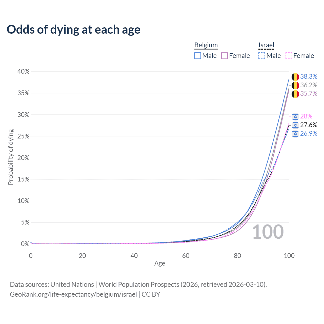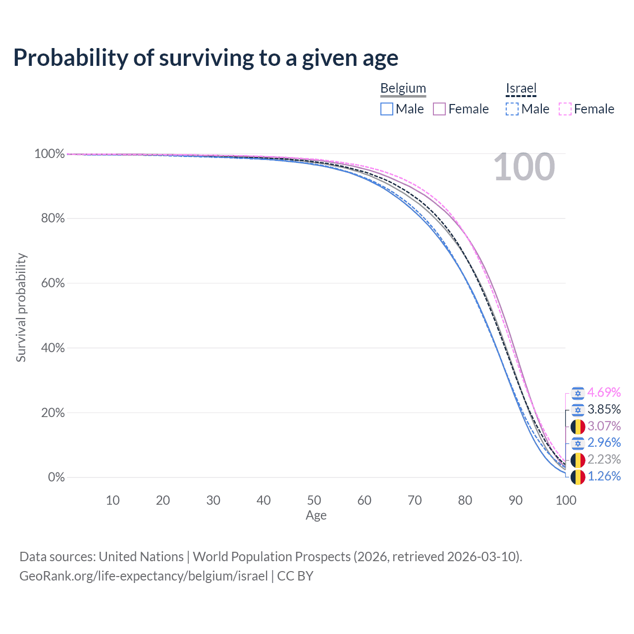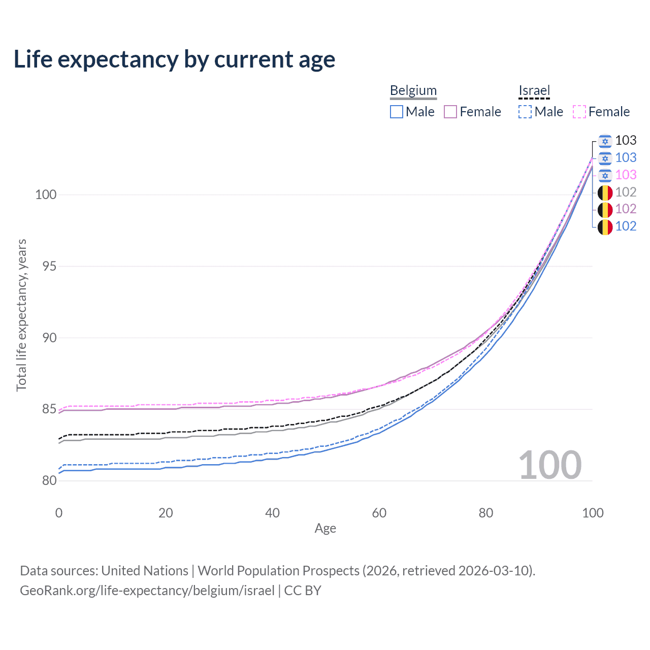 This life expectancy calculator shows the odds of living to 100, 95, 90, and below based on current age for both males and females in Belgium and Israel, along with mean and median age of death. The calculations are based on the 2026 life tables (actuarial tables) from the UN World Population Prospects.