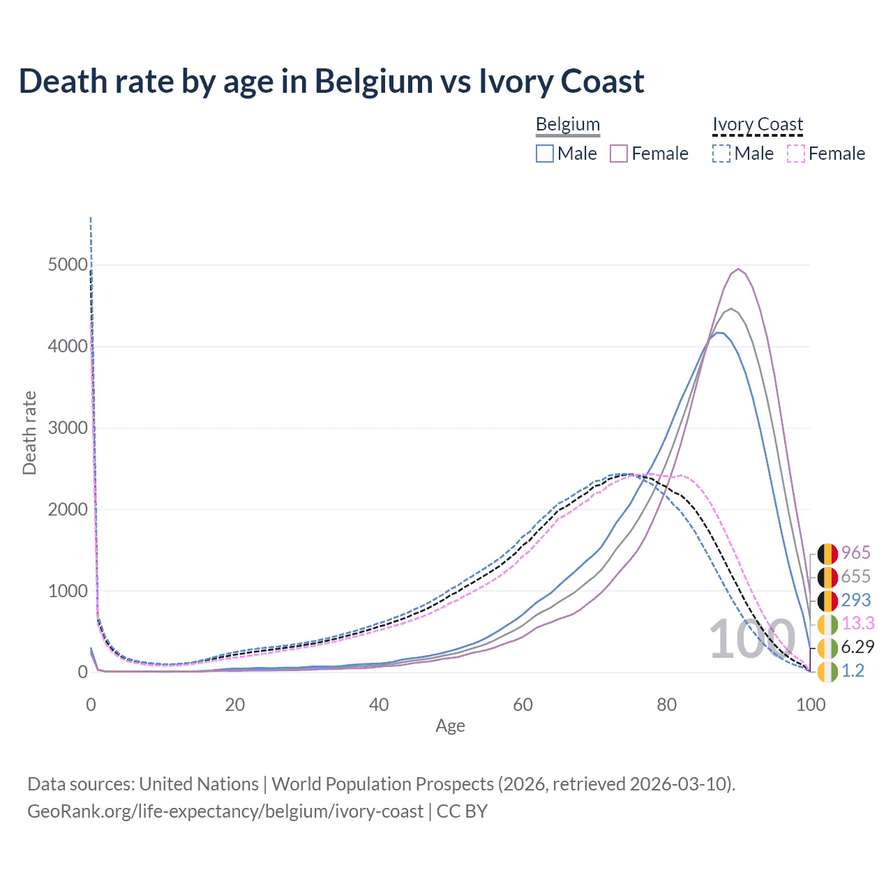 In Belgium, the most common age of death is 89, compared to 0 in Ivory Coast. The median age of death is 85.8 in Belgium and 68.6 in Ivory Coast, meaning only half of each cohort is expected to live past that age.