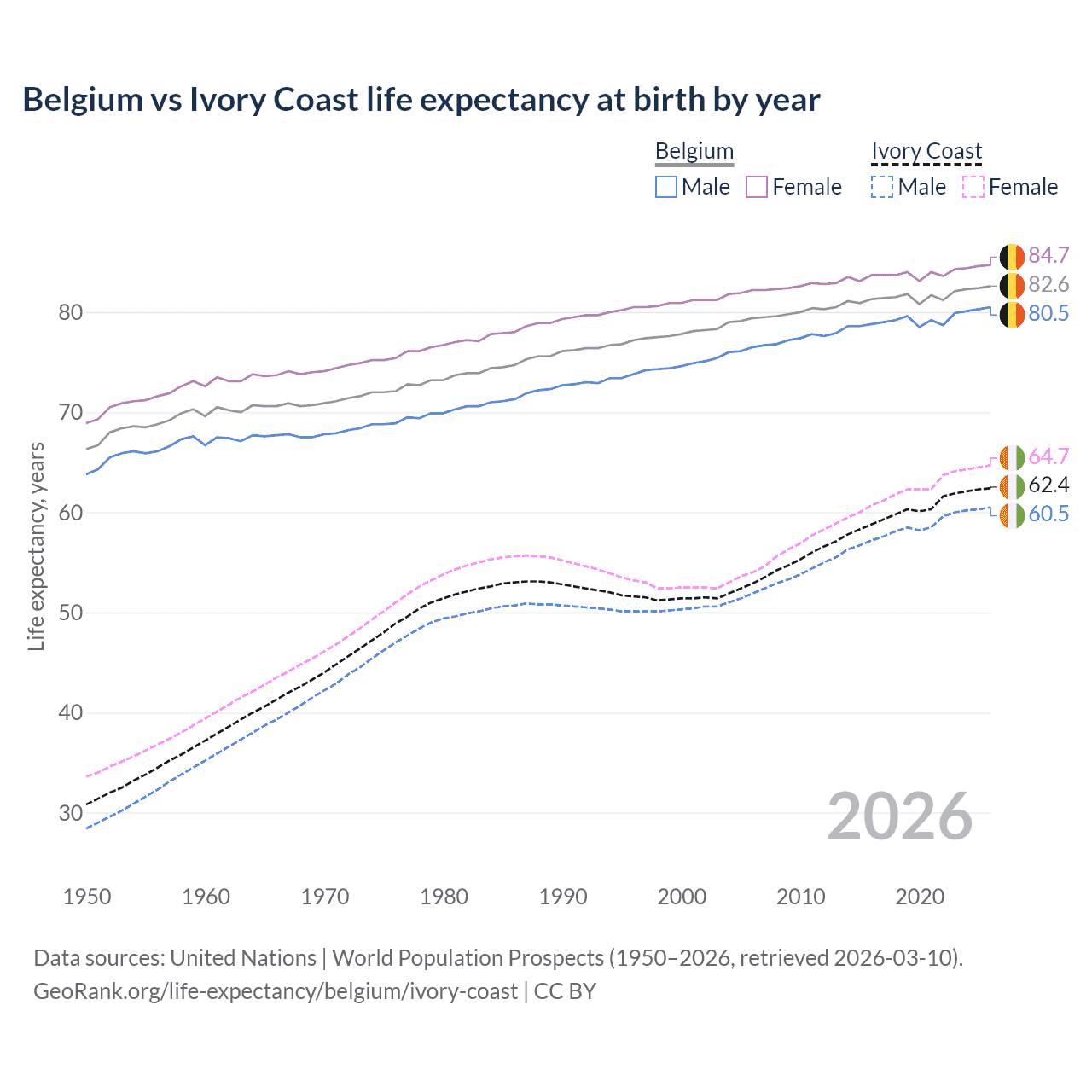 The average life expectancy at birth is 82.6 years in Belgium vs 62.4 in Ivory Coast. Belgium is ranked 26/197 by life expectancy, and Ivory Coast is 184/197. In Belgium, the life expectancy is 80.5 years for males and 84.7 years for females. In Ivory Coast, it's 60.5 years for males and 64.7 years for females.