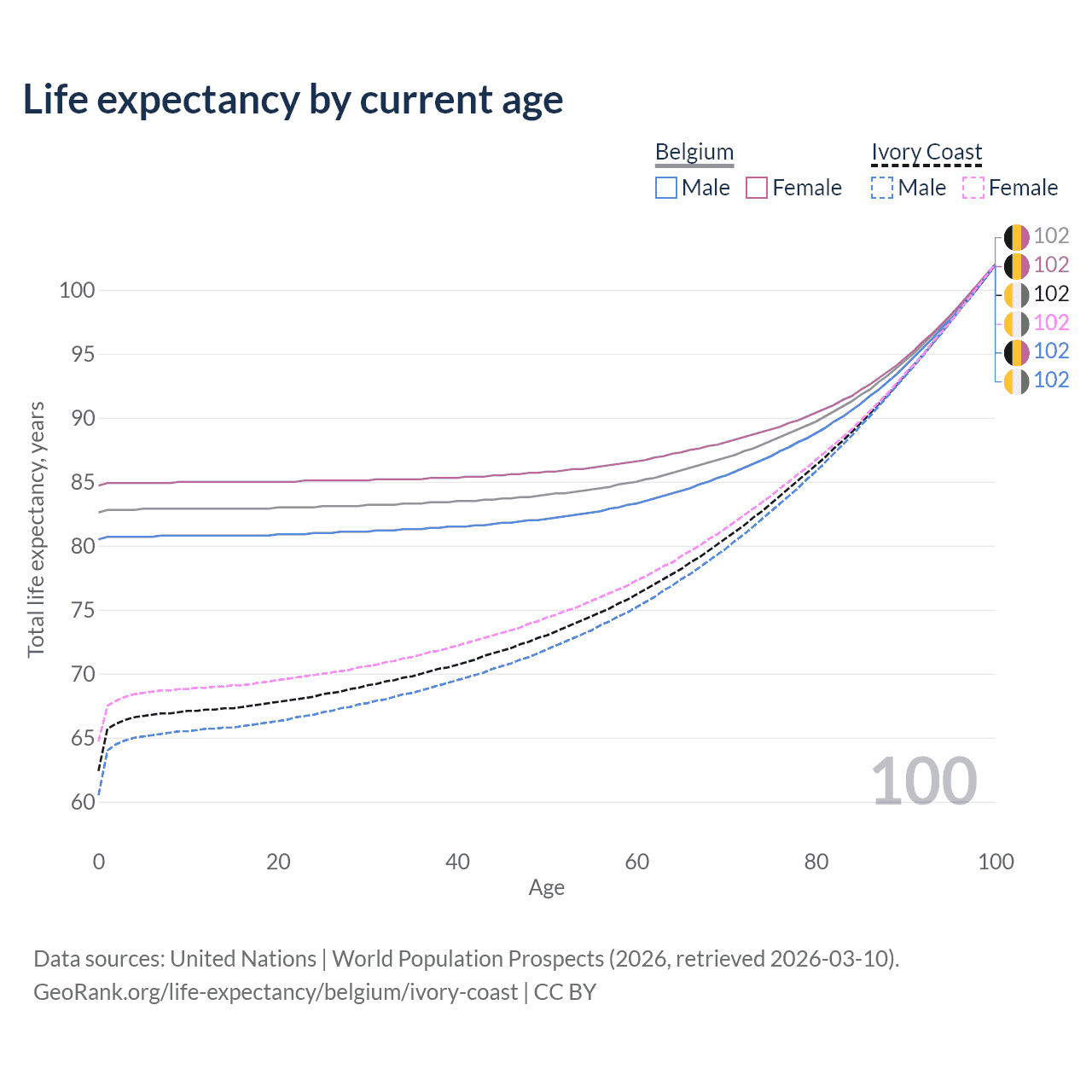 This life expectancy calculator shows the odds of living to 100, 95, 90, and below based on current age for both males and females in Belgium and Ivory Coast, along with mean and median age of death. The calculations are based on the 2026 life tables (actuarial tables) from the UN World Population Prospects.
