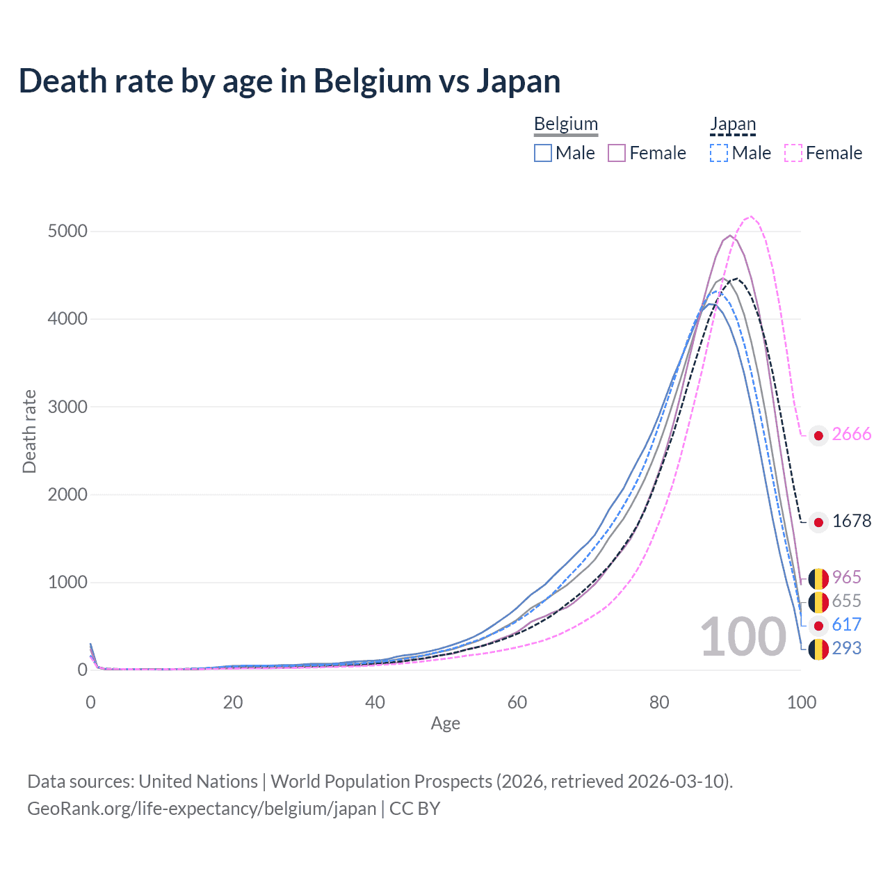 In Belgium, the most common age of death is 89, compared to 91 in Japan. The median age of death is 85.8 in Belgium and 88.1 in Japan, meaning only half of each cohort is expected to live past that age.