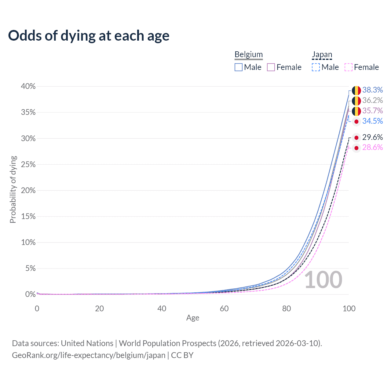 This life expectancy calculator shows the odds of living to 100, 95, 90, and below based on current age for both males and females in Belgium and Japan, along with mean and median age of death. The calculations are based on the 2026 life tables (actuarial tables) from the UN World Population Prospects.