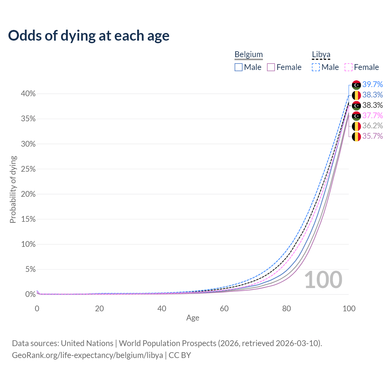This life expectancy calculator shows the odds of living to 100, 95, 90, and below based on current age for both males and females in Belgium and Libya, along with mean and median age of death. The calculations are based on the 2026 life tables (actuarial tables) from the UN World Population Prospects.
