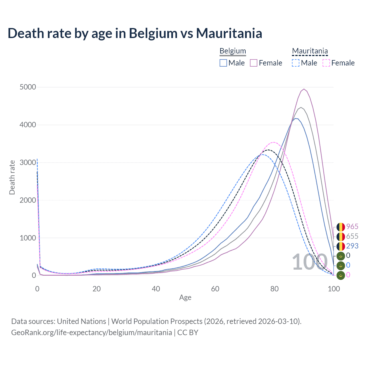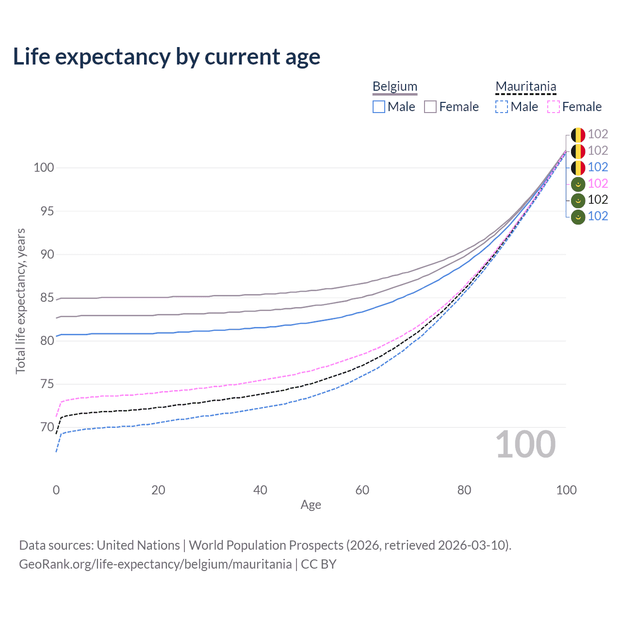 This life expectancy calculator shows the odds of living to 100, 95, 90, and below based on current age for both males and females in Belgium and Mauritania, along with mean and median age of death. The calculations are based on the 2026 life tables (actuarial tables) from the UN World Population Prospects.