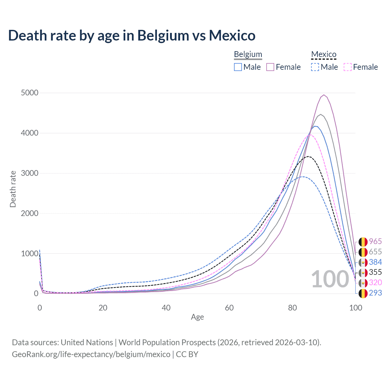 In Belgium, the most common age of death is 89, compared to 85 in Mexico. The median age of death is 85.8 in Belgium and 80.1 in Mexico, meaning only half of each cohort is expected to live past that age.