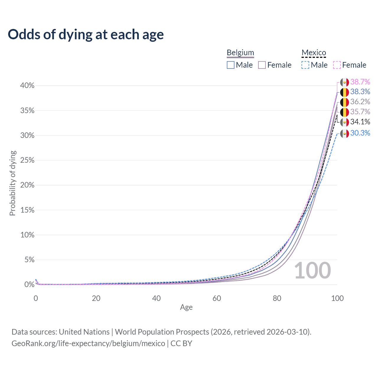 This life expectancy calculator shows the odds of living to 100, 95, 90, and below based on current age for both males and females in Belgium and Mexico, along with mean and median age of death. The calculations are based on the 2026 life tables (actuarial tables) from the UN World Population Prospects.