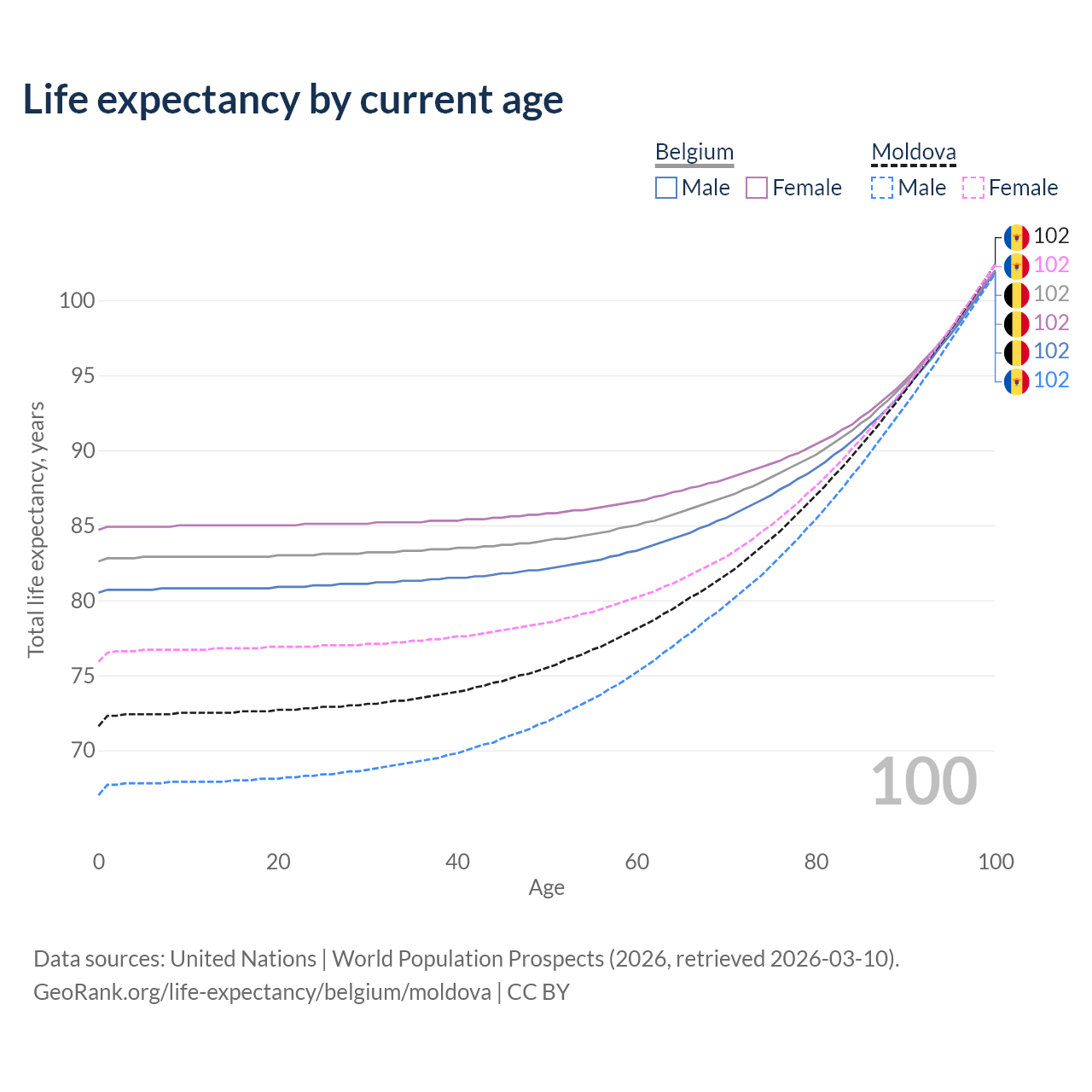 This life expectancy calculator shows the odds of living to 100, 95, 90, and below based on current age for both males and females in Belgium and Moldova, along with mean and median age of death. The calculations are based on the 2026 life tables (actuarial tables) from the UN World Population Prospects.