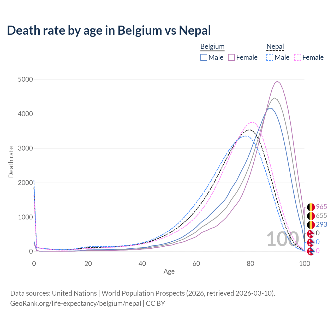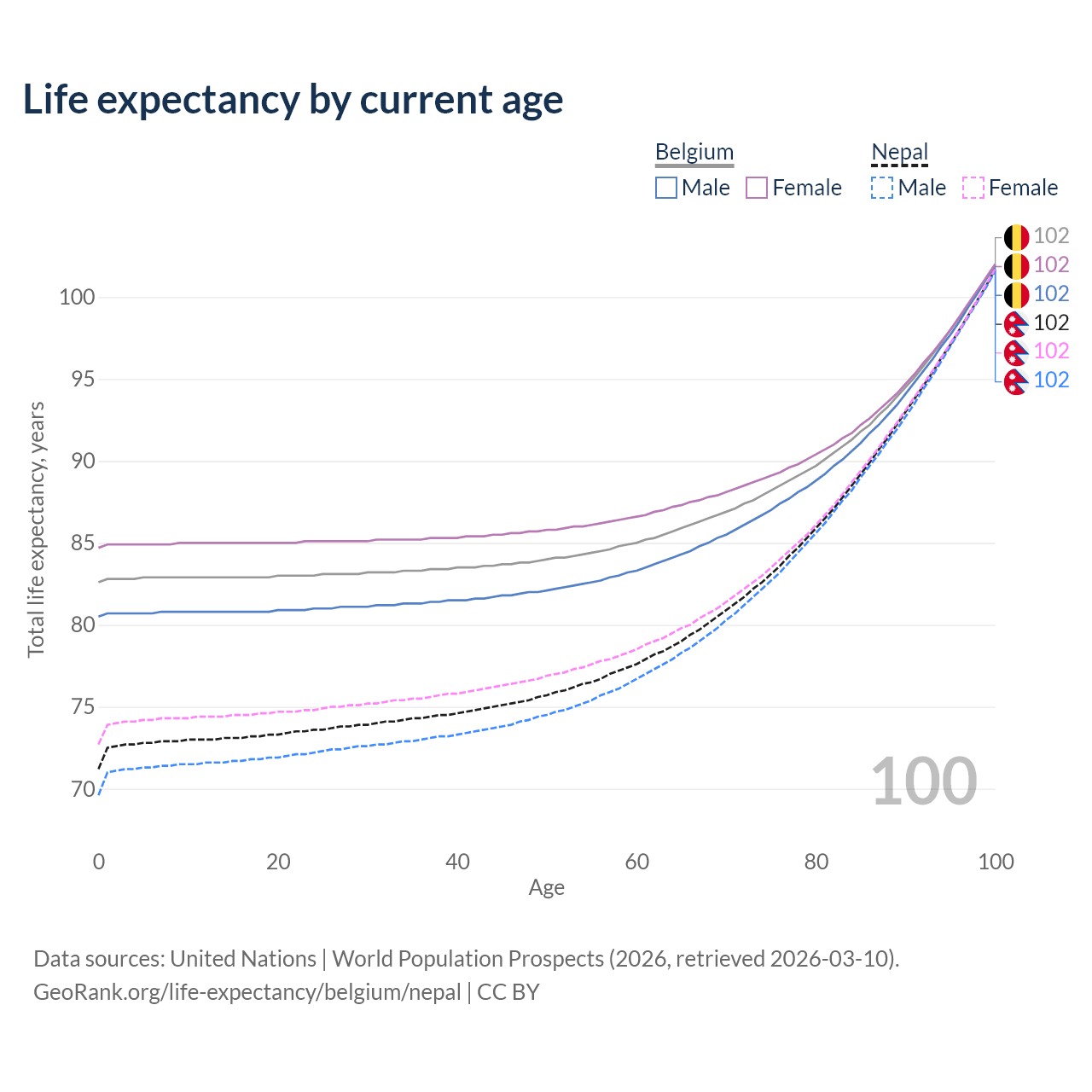 This life expectancy calculator shows the odds of living to 100, 95, 90, and below based on current age for both males and females in Belgium and Nepal, along with mean and median age of death. The calculations are based on the 2026 life tables (actuarial tables) from the UN World Population Prospects.