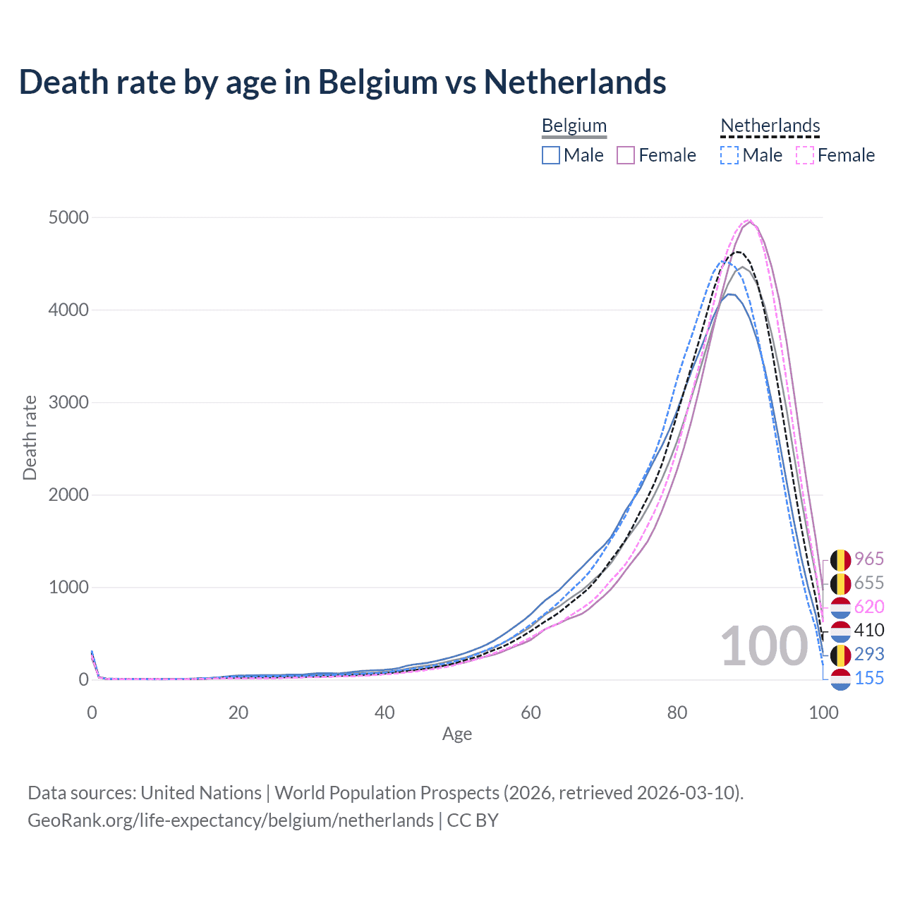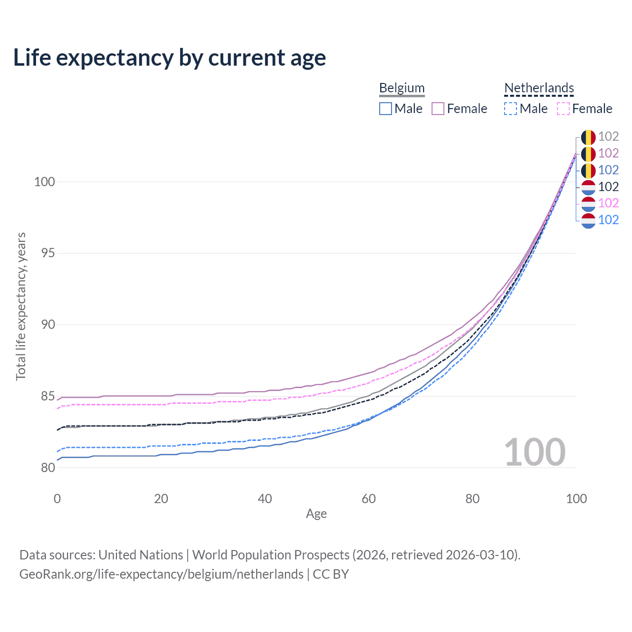 This life expectancy calculator shows the odds of living to 100, 95, 90, and below based on current age for both males and females in Belgium and the Netherlands, along with mean and median age of death. The calculations are based on the 2026 life tables (actuarial tables) from the UN World Population Prospects.