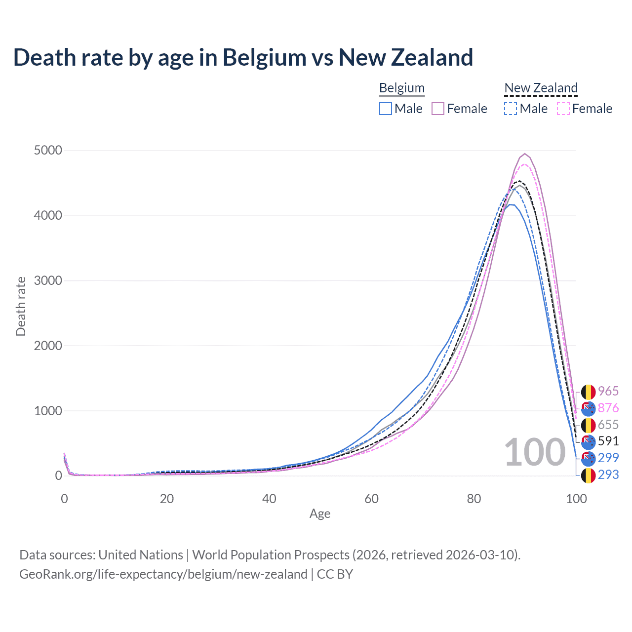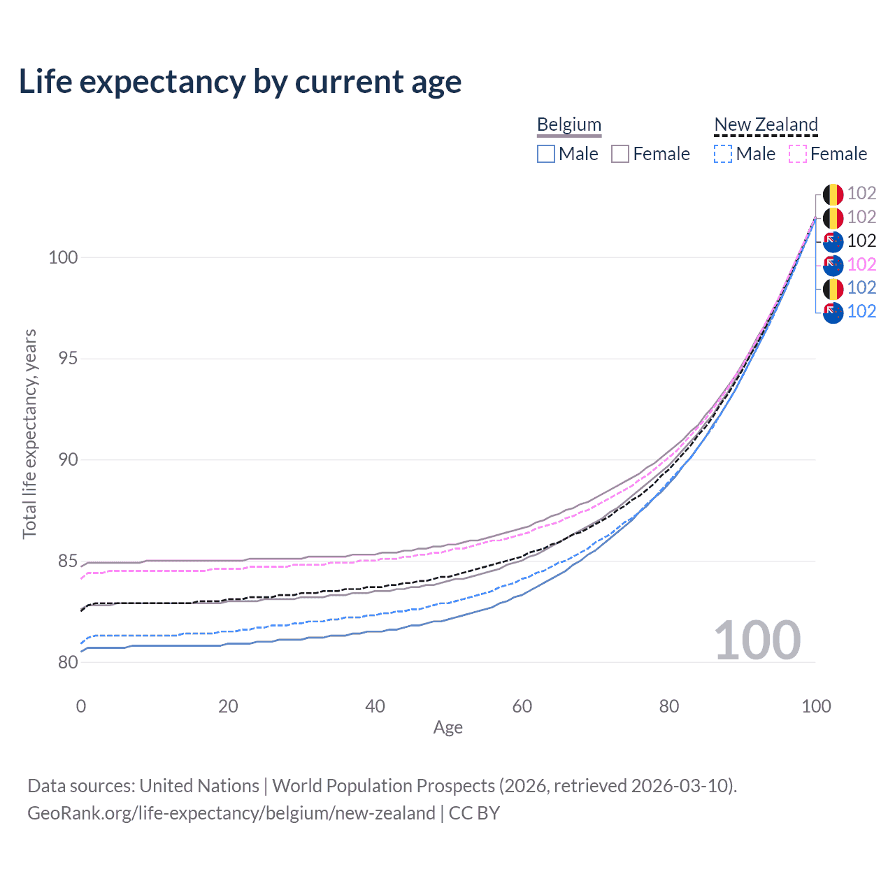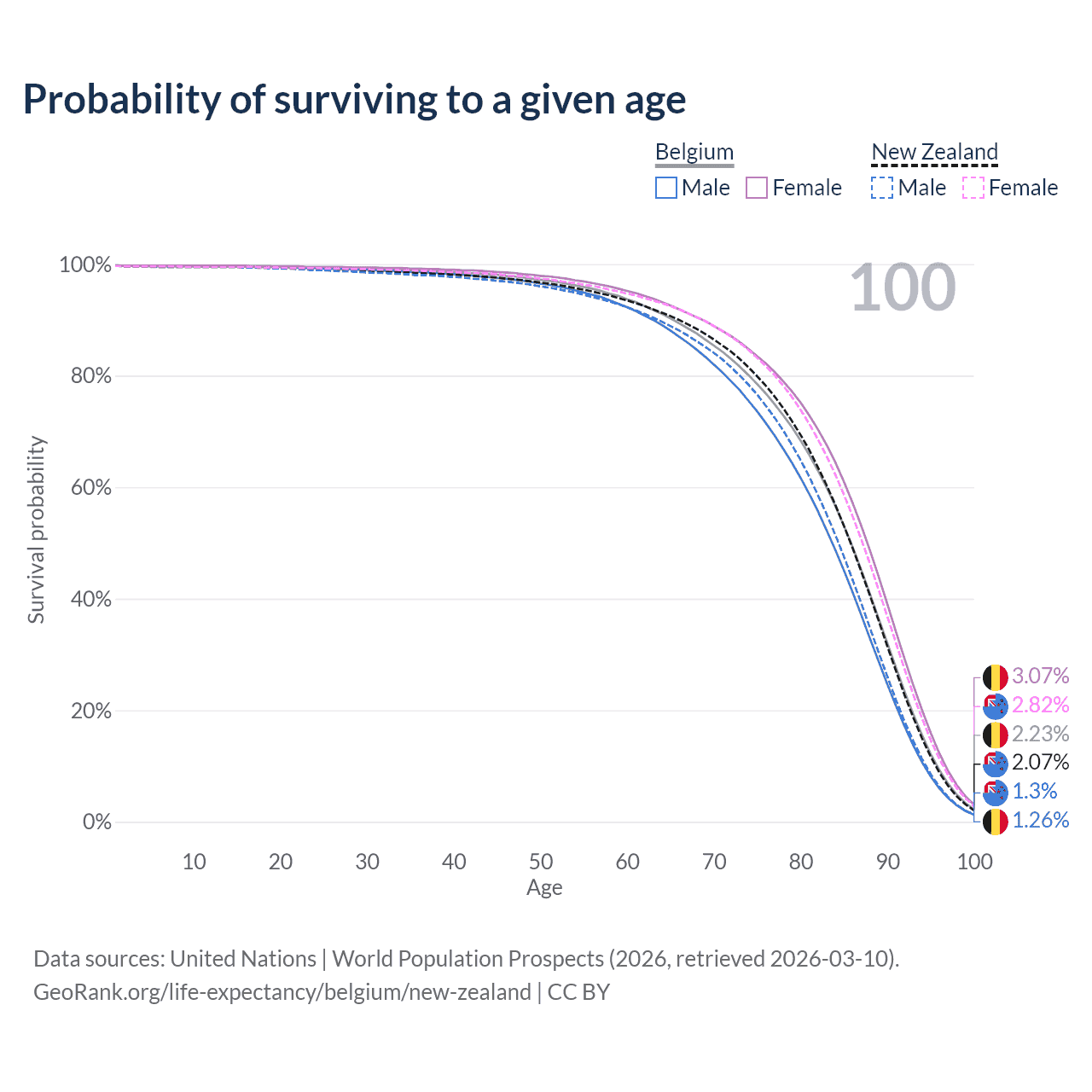This life expectancy calculator shows the odds of living to 100, 95, 90, and below based on current age for both males and females in Belgium and New Zealand, along with mean and median age of death. The calculations are based on the 2026 life tables (actuarial tables) from the UN World Population Prospects.