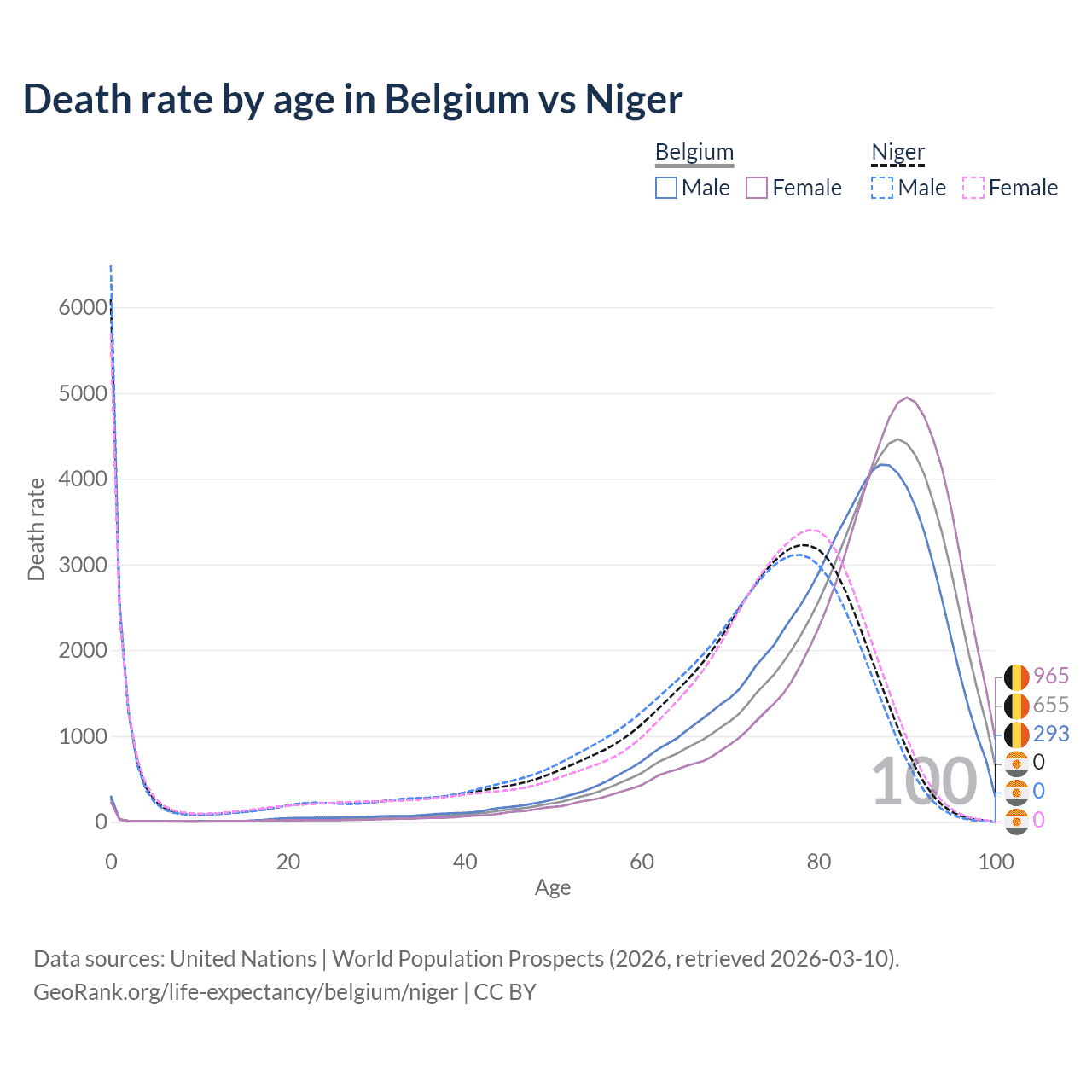 In Belgium, the most common age of death is 89, compared to 0 in Niger. The median age of death is 85.8 in Belgium and 71.7 in Niger, meaning only half of each cohort is expected to live past that age.