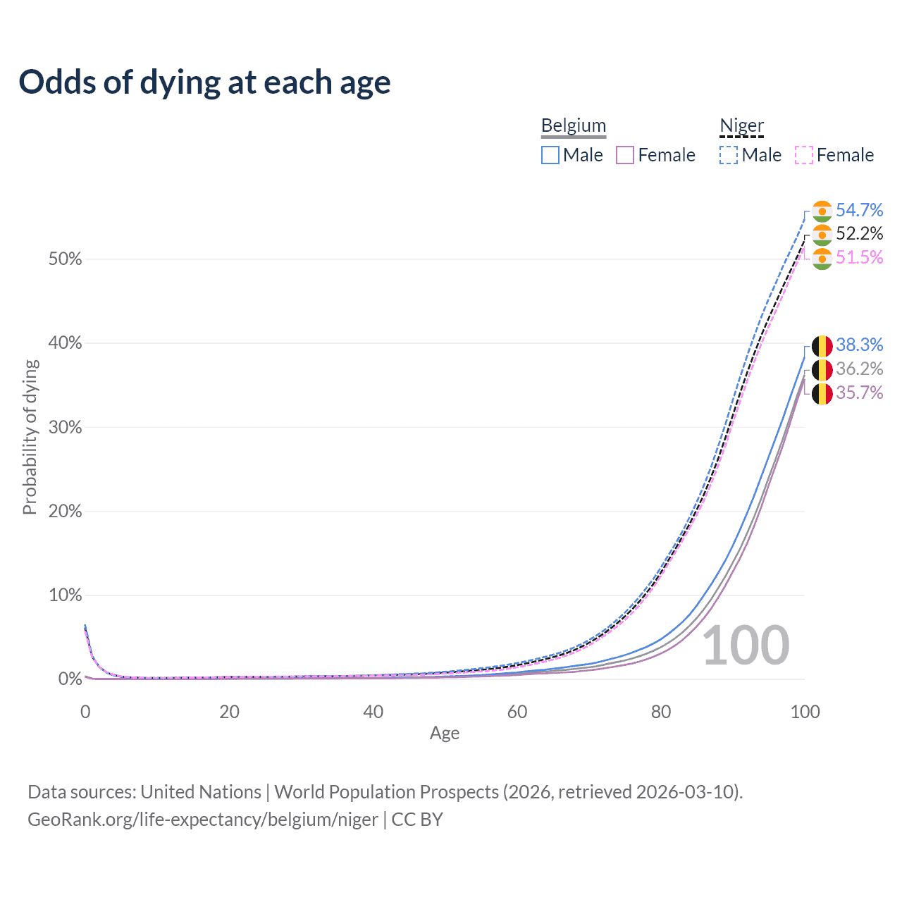This life expectancy calculator shows the odds of living to 100, 95, 90, and below based on current age for both males and females in Belgium and Niger, along with mean and median age of death. The calculations are based on the 2026 life tables (actuarial tables) from the UN World Population Prospects.