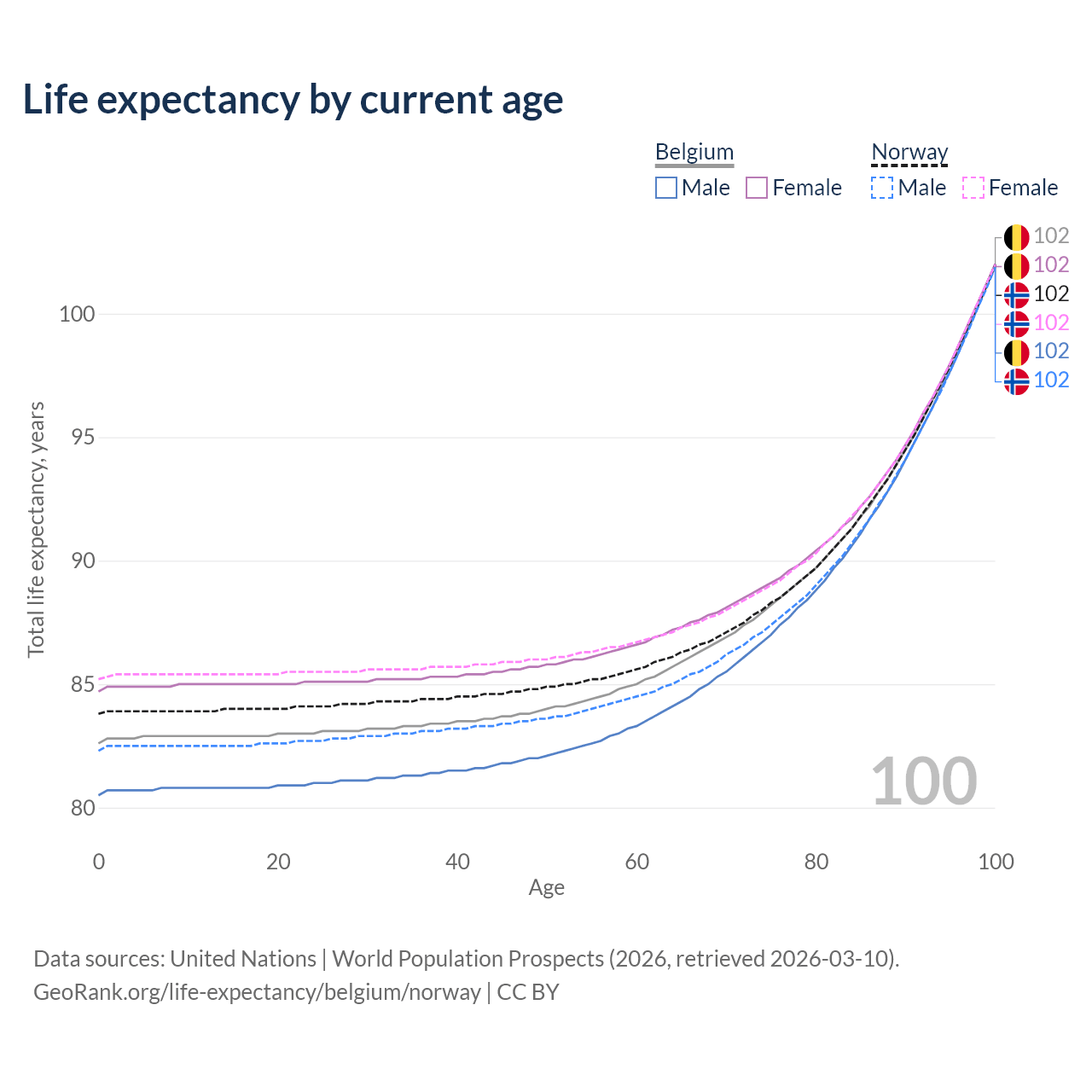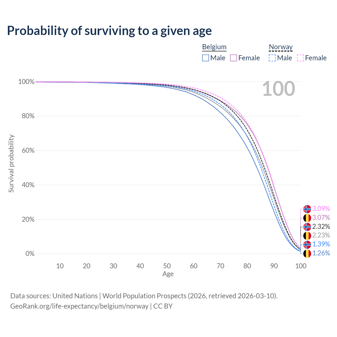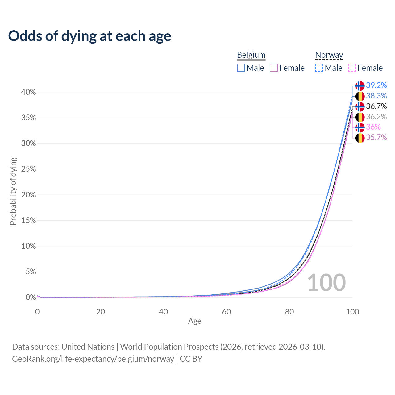 This life expectancy calculator shows the odds of living to 100, 95, 90, and below based on current age for both males and females in Belgium and Norway, along with mean and median age of death. The calculations are based on the 2026 life tables (actuarial tables) from the UN World Population Prospects.