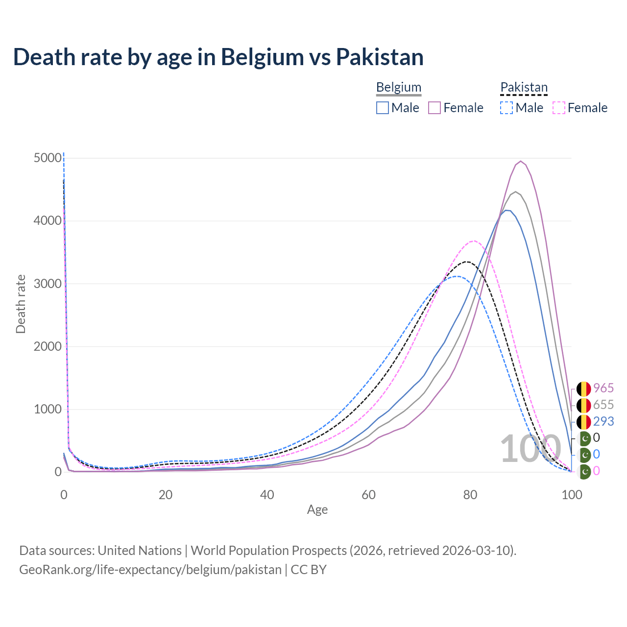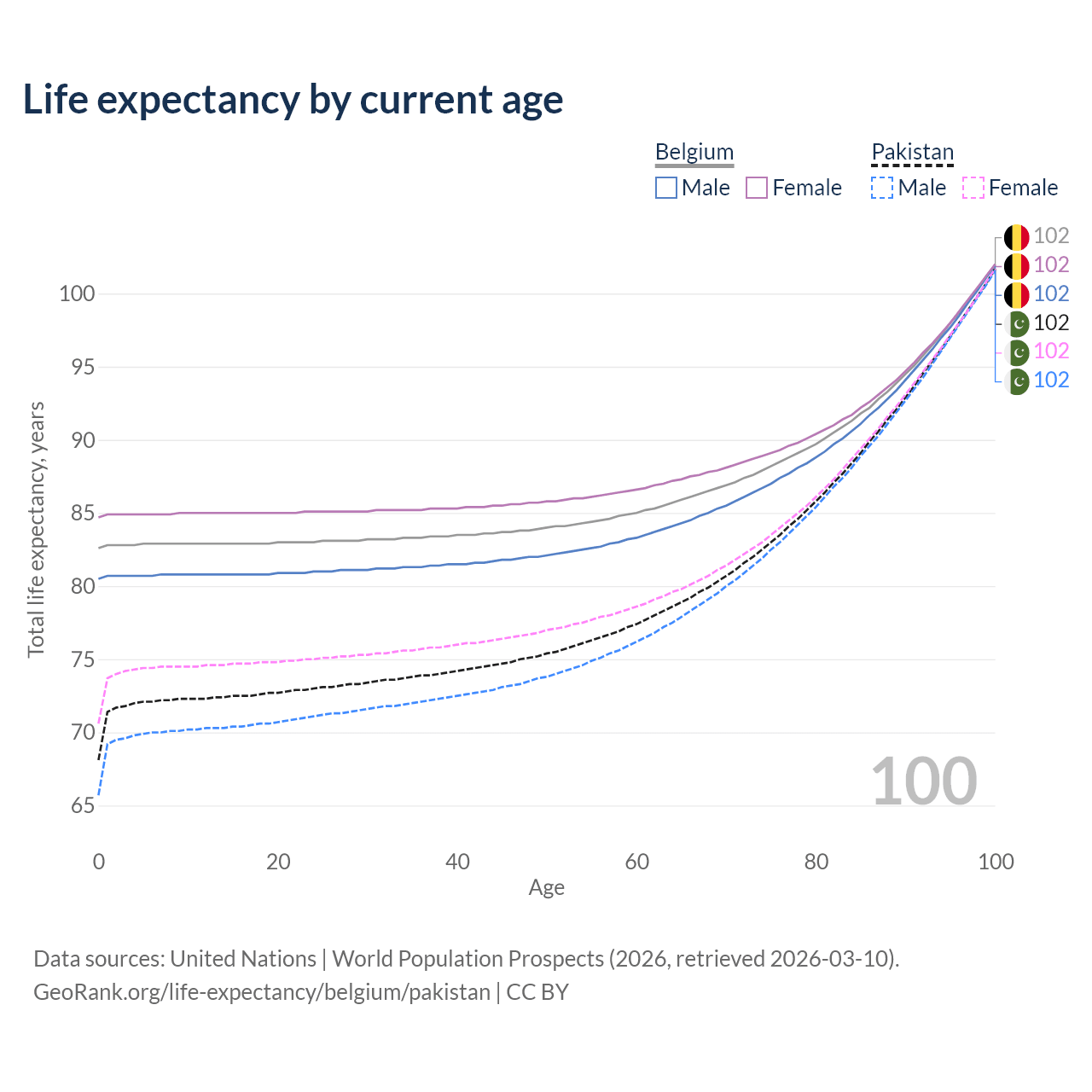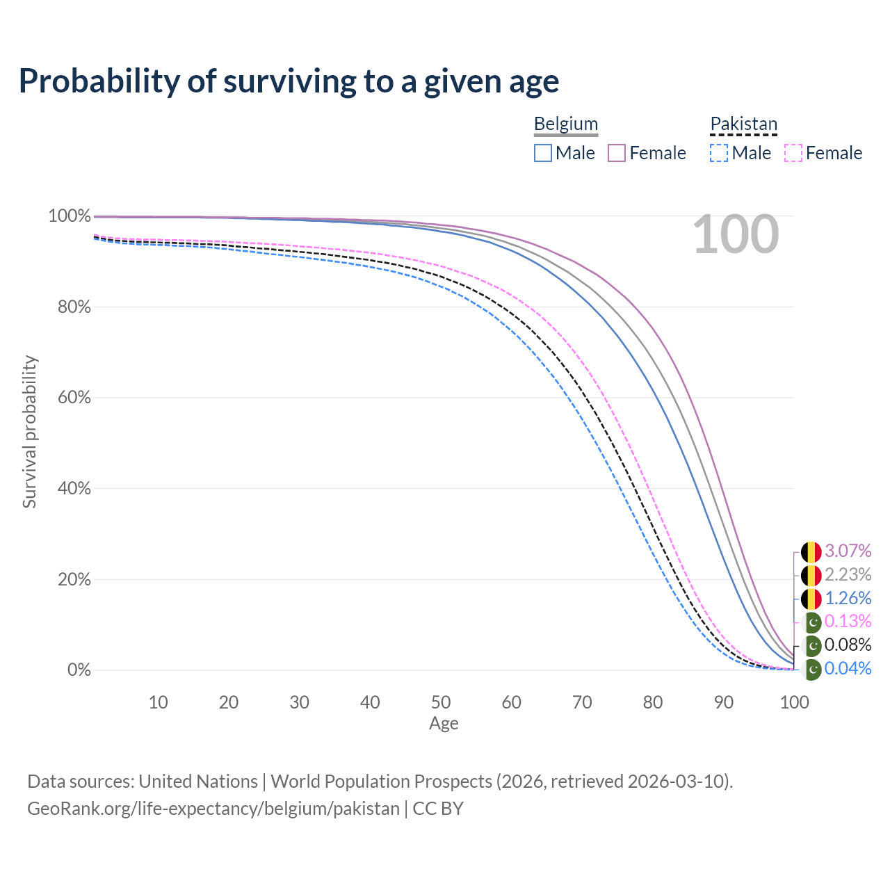 This life expectancy calculator shows the odds of living to 100, 95, 90, and below based on current age for both males and females in Belgium and Pakistan, along with mean and median age of death. The calculations are based on the 2026 life tables (actuarial tables) from the UN World Population Prospects.