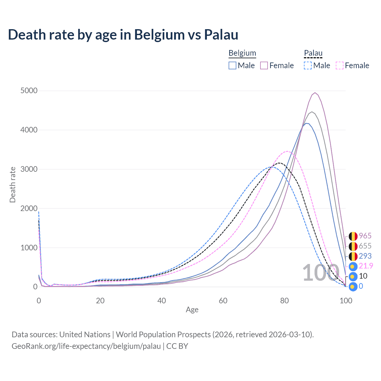 In Belgium, the most common age of death is 89, compared to 78 in Palau. The median age of death is 85.8 in Belgium and 73.8 in Palau, meaning only half of each cohort is expected to live past that age.