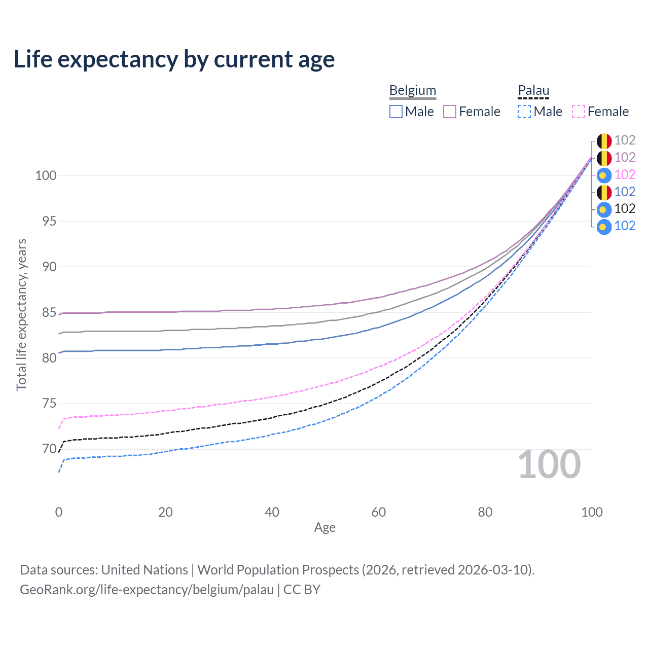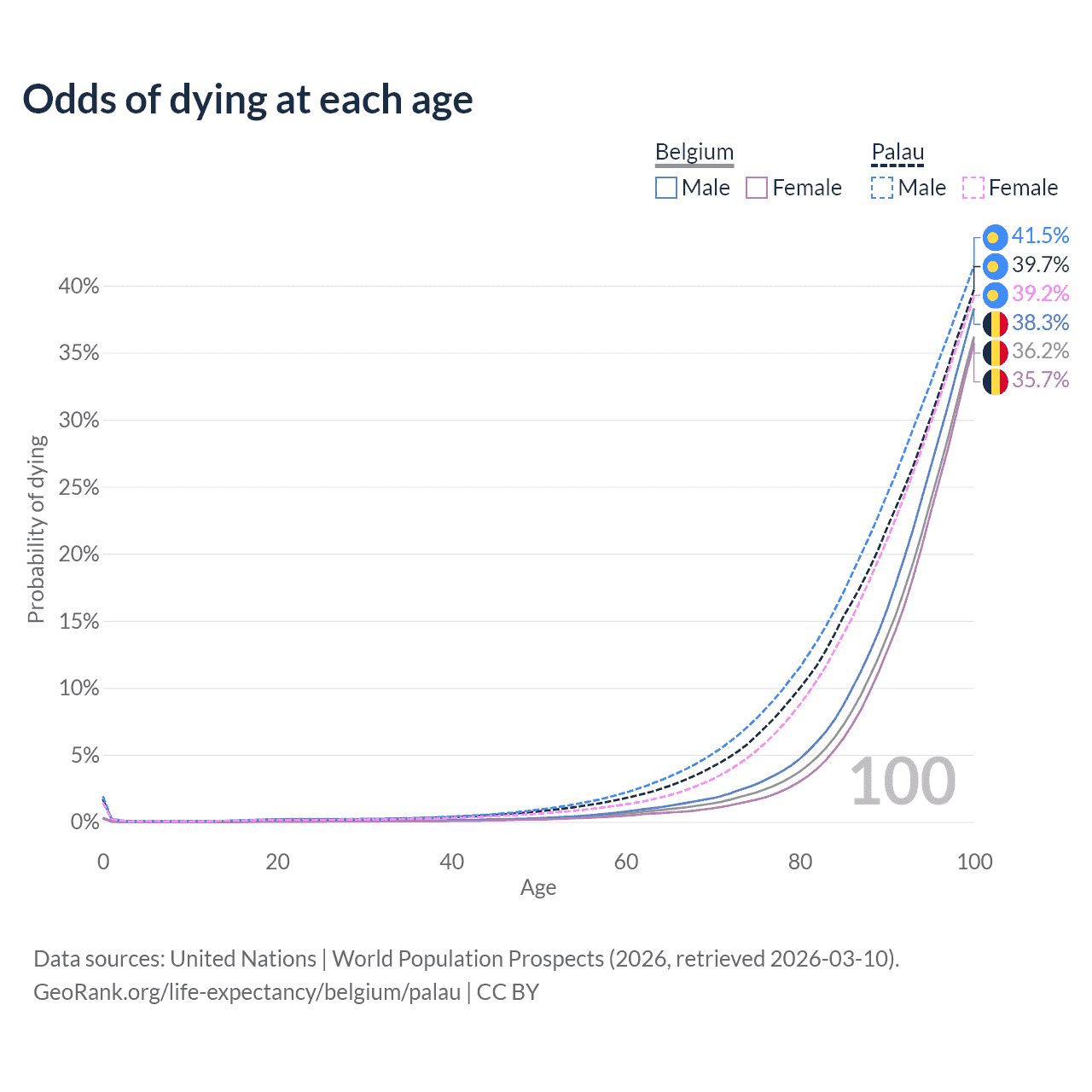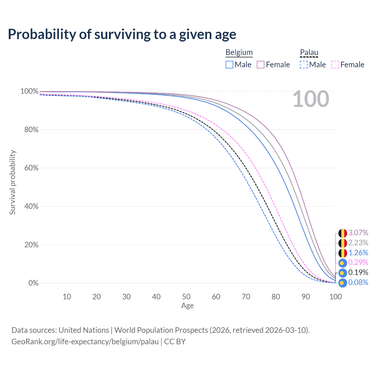 This life expectancy calculator shows the odds of living to 100, 95, 90, and below based on current age for both males and females in Belgium and Palau, along with mean and median age of death. The calculations are based on the 2026 life tables (actuarial tables) from the UN World Population Prospects.