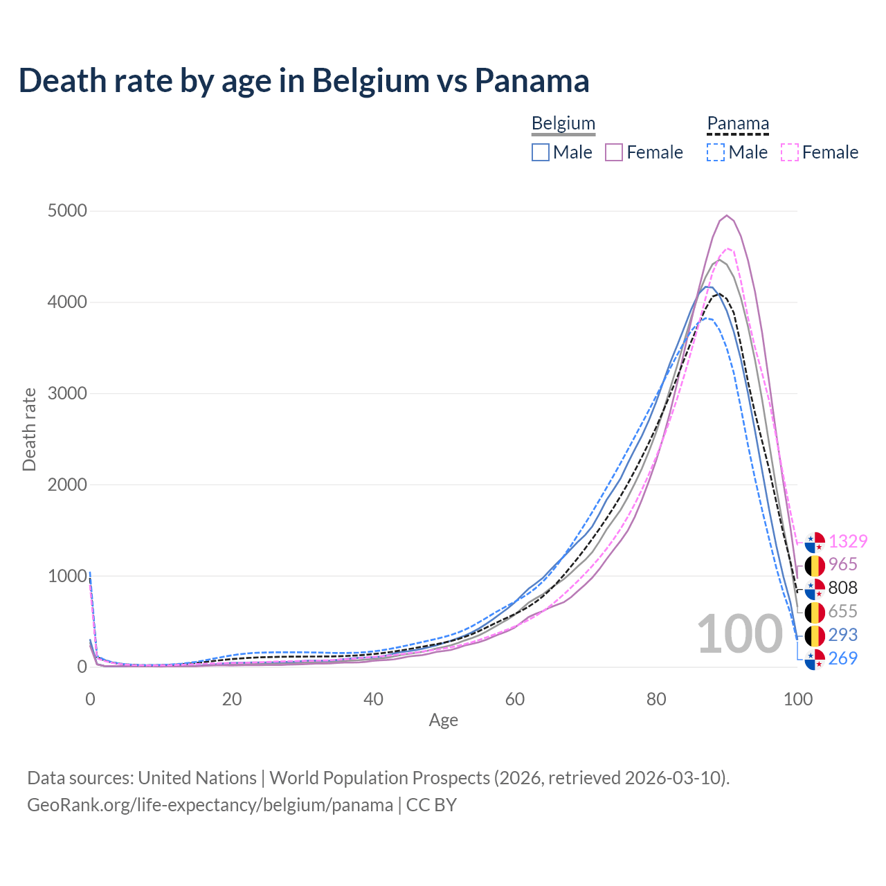 In Belgium, the most common age of death is 89, compared to 89 in Panama. The median age of death is 85.8 in Belgium and 84.6 in Panama, meaning only half of each cohort is expected to live past that age.