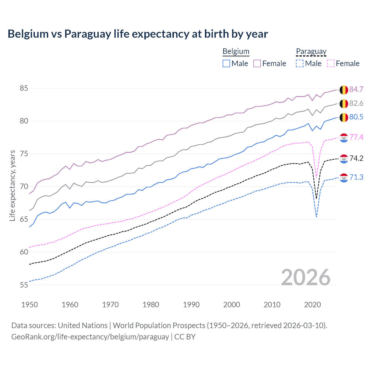 The average life expectancy at birth is 82.6 years in Belgium vs 74.2 in Paraguay. Belgium is ranked 26/197 by life expectancy, and Paraguay is 100/197. In Belgium, the life expectancy is 80.5 years for males and 84.7 years for females. In Paraguay, it's 71.3 years for males and 77.4 years for females.