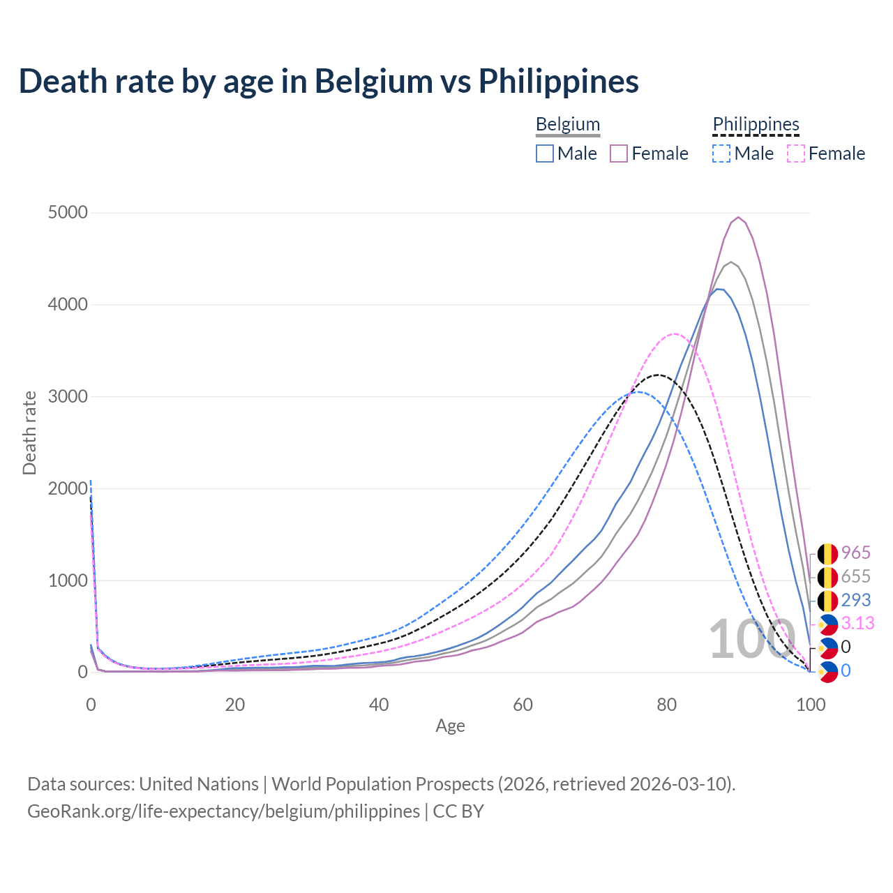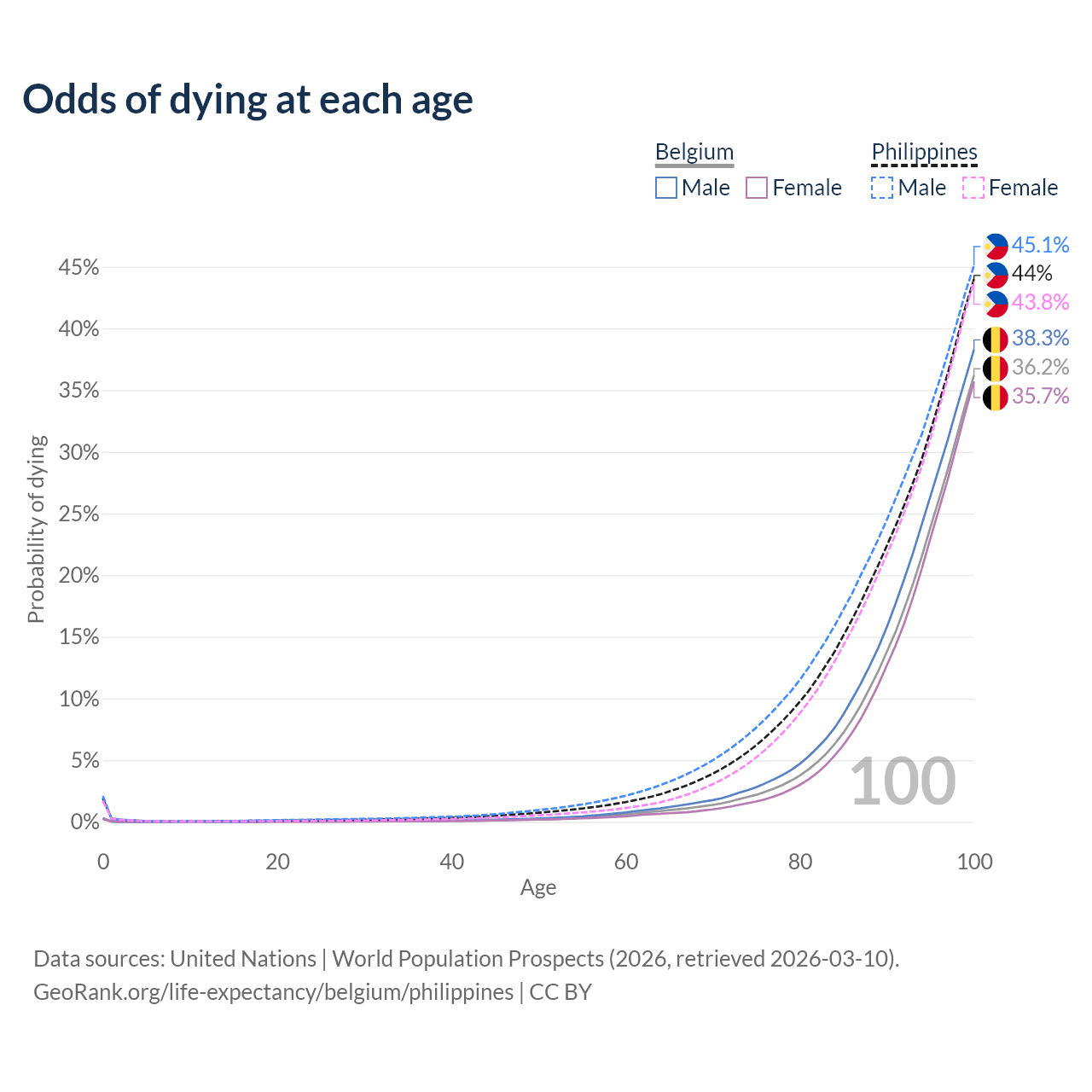 This life expectancy calculator shows the odds of living to 100, 95, 90, and below based on current age for both males and females in Belgium and the Philippines, along with mean and median age of death. The calculations are based on the 2026 life tables (actuarial tables) from the UN World Population Prospects.